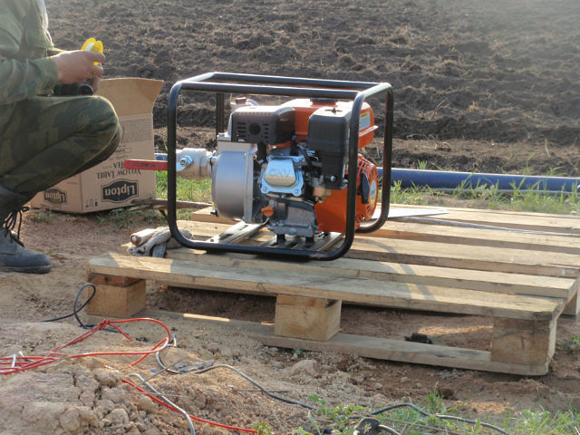 Воду качаем из бассейна бензиновой мотопомпой.