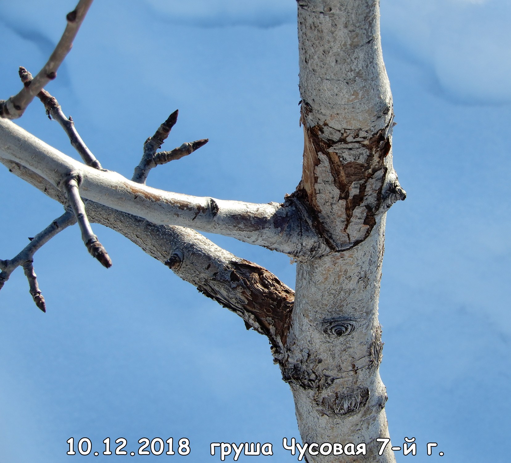 Ладу, как и Георгий(дед Мороз) оцениваю менее зимостойкой, чем Чижовская. Однажды Лада(привитая внизу) меня сильно подвела уже весной. В глубокой снежной воронке вокруг ствола концентрировались солнечные лучи и сильно обожгли кору(солнечный ожог). На Чижовской это невозможно, потому иногда использовал её в качестве высокого зимостойкого штамба и прочного скелета для своих "груша-сад".