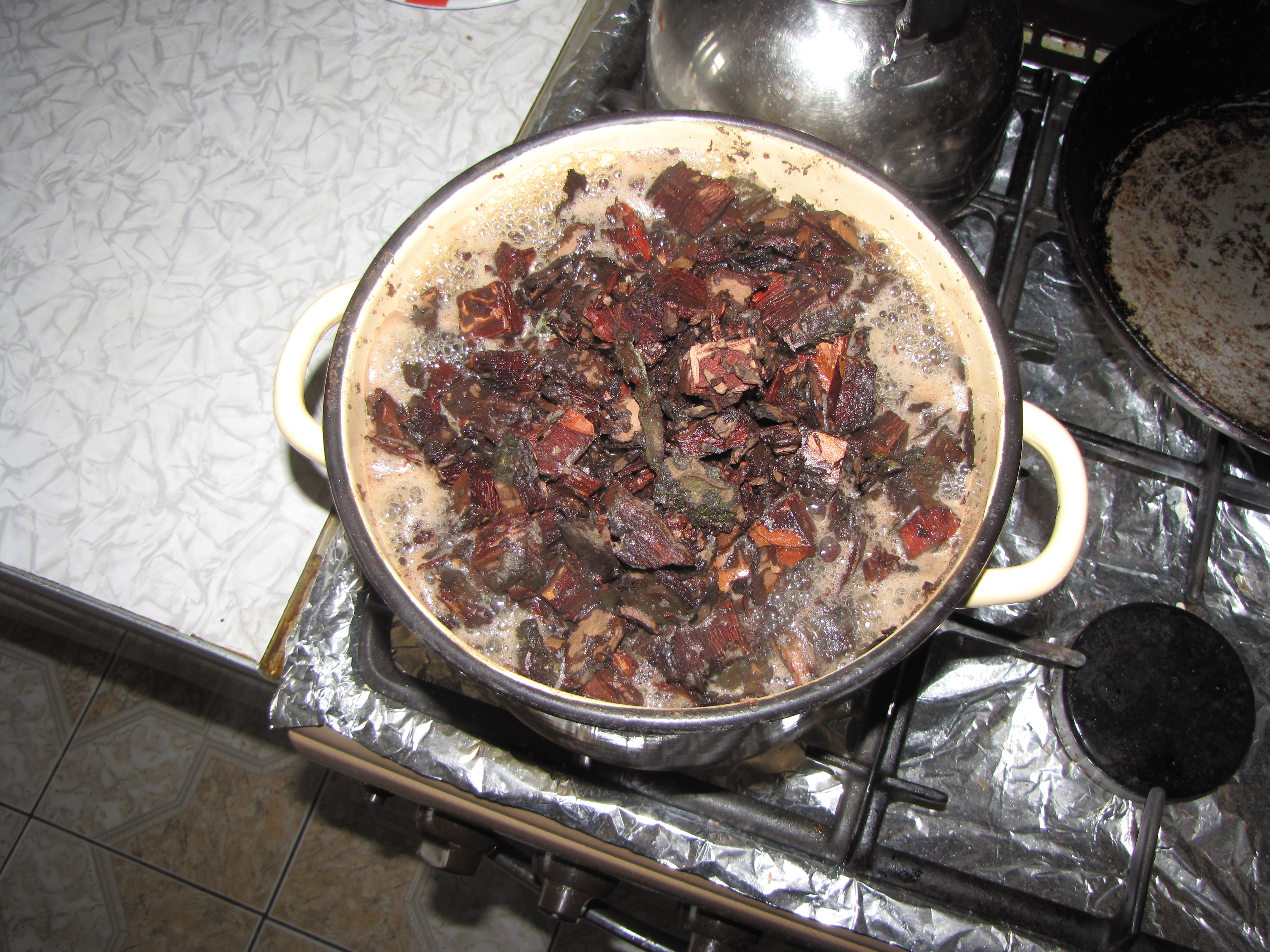 Как то по весне возникла у меня необходимость, а если быть точнее, то, желание, омолодить некоторые орхидеи (фаленопсисы), а то уж больно голые стебли у них стали. Решил немного об этом рассказать. Для начала выбрал в лесу погибшую сосну, дерево ещё стояло, но уже сухое, поэтому надрать коры из нижней части ствола не составило труда. Дома секатором кору измельчил на кусочки 1-1,5 см, засыпал в кастрюлю и некоторое время варил, дабы уничтожить возможную инфекцию (главное не сказать жене, что это зелье приворотное, а то можно по морде лица схлопотать). Следующим шагом срезал верхнюю часть растения с листьями и несколькими хорошо развитыми корнями. Срез делался скорее по принципу "где удобнее секатор просунуть". В одном случае на стебле осталась проснувшаяся почка (на фото), в другом - просто пенёк с корнями, без видимых признаков почки, только пеньки от цветоносов (но, именно под этими пеньками закладывается ростовая спящая почка). После этого вытряхнул растения из горшков и просеял оставшуюся кору, всё, что прошло через дырки горшка - в мусор, оставшуюся часть разделил между двумя полученными растениями. У пеньков удалил нижние части стебля - корни на них уже поотмирали, а эта часть стебля высохла. Живые корни по возможности укоротил (в первую очередь это касается верхушки, её корни уже не хотели расти в грунт, а топорщились в разные стороны, иногда надламывались - вот по этим местам надломов я и делал срезы). После этого вращательным движением поместил корни верхушек в новые горшки (при таком движении они меньше ломаются). Нижняя часть горшка была засыпана половиной "родного" грунта (вторую половину получил пенёк), далее начал подсыпать уже остывшую к тому времени вареную кору, горшок при этом слегка потряхивал, постукивал, слегка обжимал - это позволяет лучше заполнить пространство между корнями. Так как срезы на верхушках были свежие, а их дезинфекцией я не заморачивался, то сразу весь горшок корой не заполнял, примерно на 2/3, через пару дней, когда срезы подсохли, заполнил корой оставшуюся часть. Никакого дополнительного ухода за растениями не проводил, влажность не повышал (дабы не загнивали срезы).