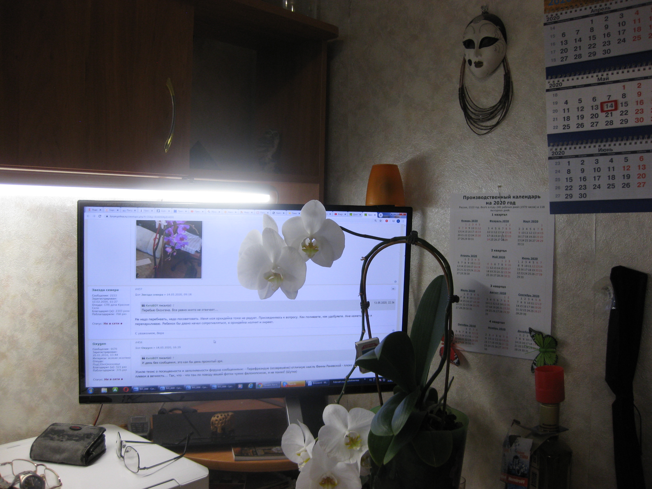 фотография сделана в начале апреля. Мои орхидеи (фаленопсисы) сейчас посажены в грунт, состоящий из коры (орхиаты) и Grow Plant (Гидротон). Постепенно пересадила все из стеклянных колб в пластиковые двойные горшки - мне так удобнее поливать. Удобрение использую Fertika кристалон для орхидей. Есть подсветка. Пока фаленопсисы были в стекле, поливала примерно раз в месяц, сейчас смотрю по грунту и размеру горшка и мелкие поливаю раз-два в неделю, те что в больших горшках раз в полторы-две недели.