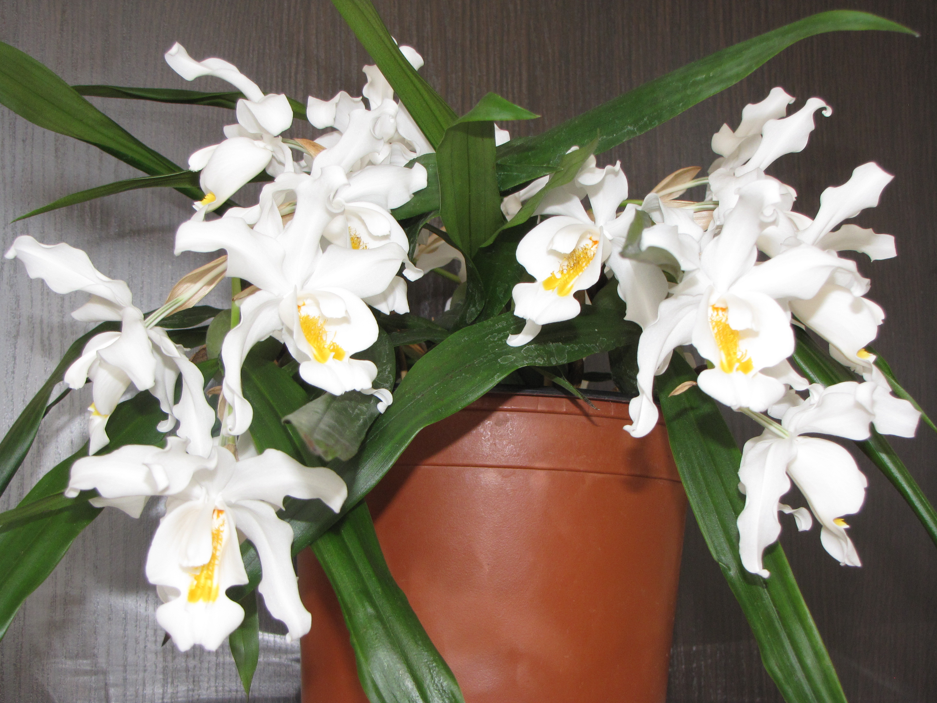 Шла речь о уходе за орхидеями, решил немного рассказать о своих. На снимке целогина гребенчатая, цветение этого года (февральское). Растение у меня 5 или 6 лет, цветёт ежегодно. Горшок, на вскидку, около 2 литров, нижняя четверть заполнена торфом, далее следует сосновая кора, в которую, собственно, и высажено растение. Полив раз в неделю прямо дождиком в ванной, благо качество водопроводной воды у нас это позволяет, из расчёта, чтобы вода прошла горшок насквозь, затем горшок отстаивается минут 15 в ванной и выставляется на постоянное место, вода при этом в поддон уже не просачивается. Постоянное место - застеклённая лоджия северной экспозиции, согласно показаний бытового термометра, температура, зимой, не опускается ниже + 5 градусов, для собственного успокоения в самые сильные морозы открываю внутреннее окно (из кухни на лоджию) и ставлю растение на подоконник. С момента пересадки растения в торф идёт третий год, бульбы в первый год выросли примерно в 2 раза крупнее обычного, на второй год были несколько мельче предыдущего года, но увеличилось их количество. Цветоносы до пересадки давали 3-4 цветка, теперь количество доходит до 6, но, судя по подсыхающим верхушкам, это не предел, вероятно нужен более регулярный уход.