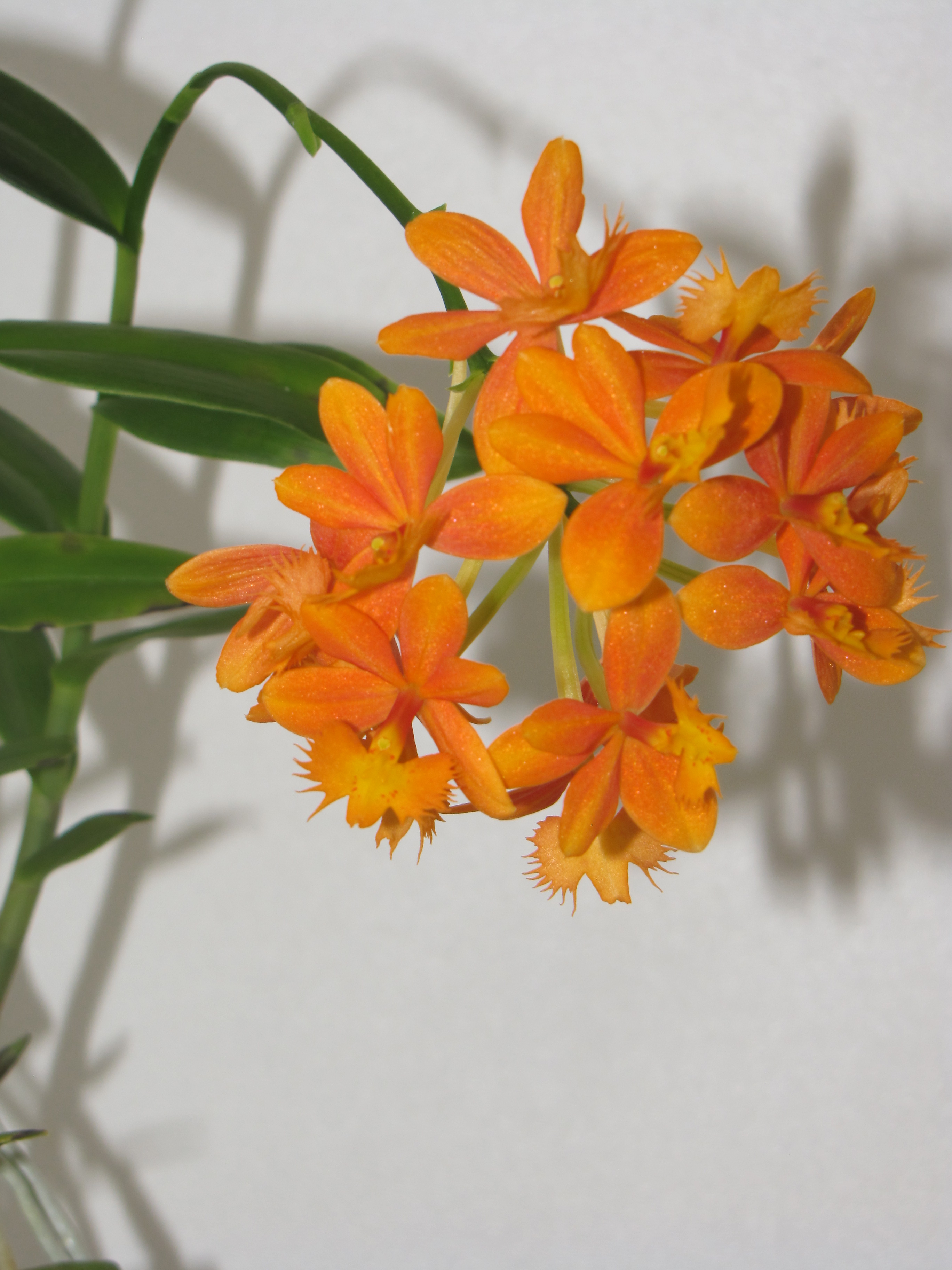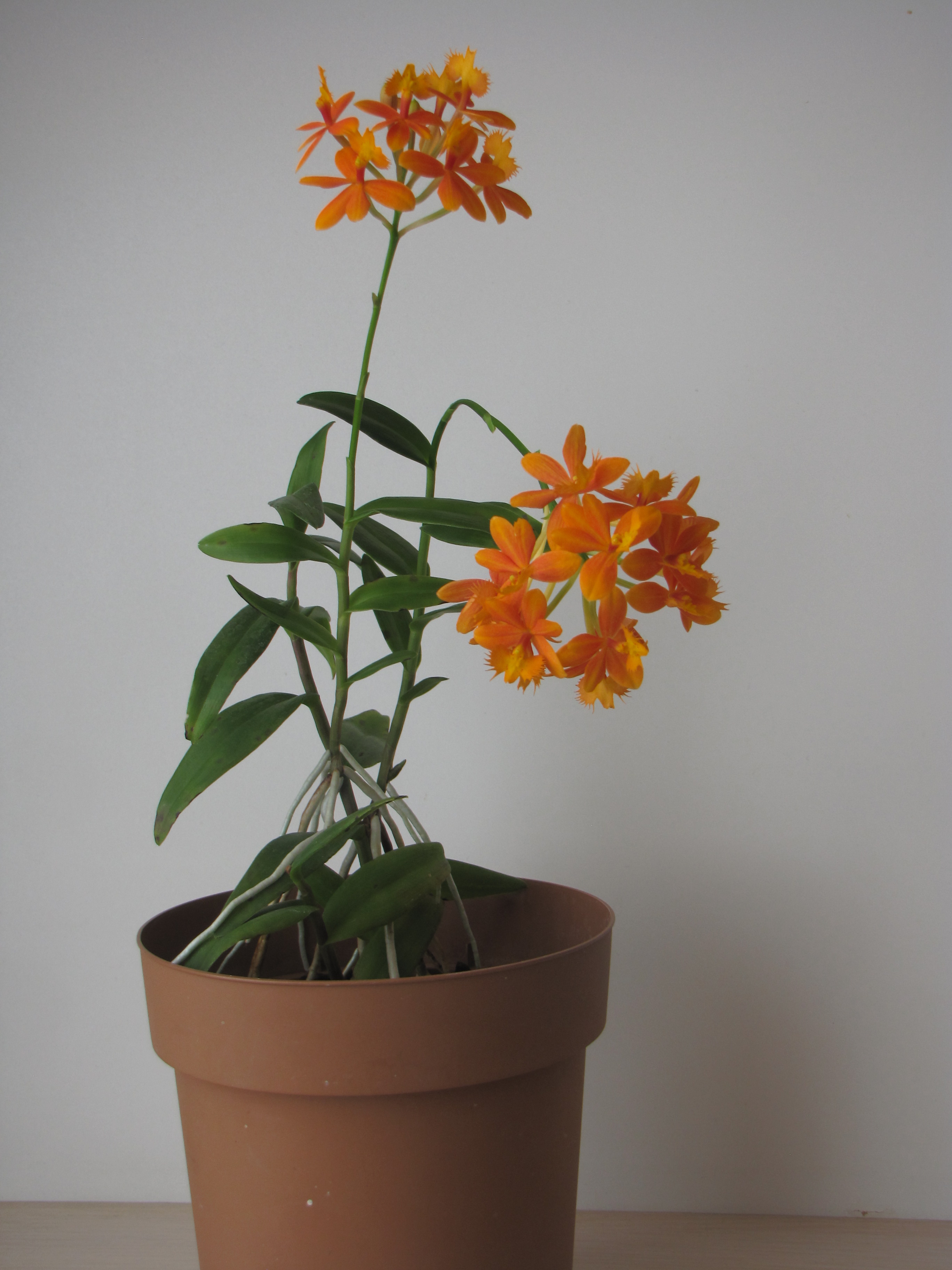 Ещё один вид орхидей, с которым, как я считаю, удалось подружиться. Если не ошибся с определением, эпидендрум укореняющийся (Epidendrum radicans), согласно найденной информации грунтовая орхидея. Осенью подруга дала черенок с двумя проснувшимися почками, за зиму укоренился, дал приросты, правда пока слабые, но оба зацвели, один под собственным весом согнулся. Посадил примерно в 1,5 л горшок, нижняя треть - грунт из кротовины на окраине торфяника (что удалось найти в конце декабря), остальное - рубленая сосновая кора, отработавшая у фаленопсисов, естественно, переваренная. Полив, как и остальных орхидей, раз в неделю, из дождика, стоит пока на северной лоджии, но на зиму заберу в помещение.