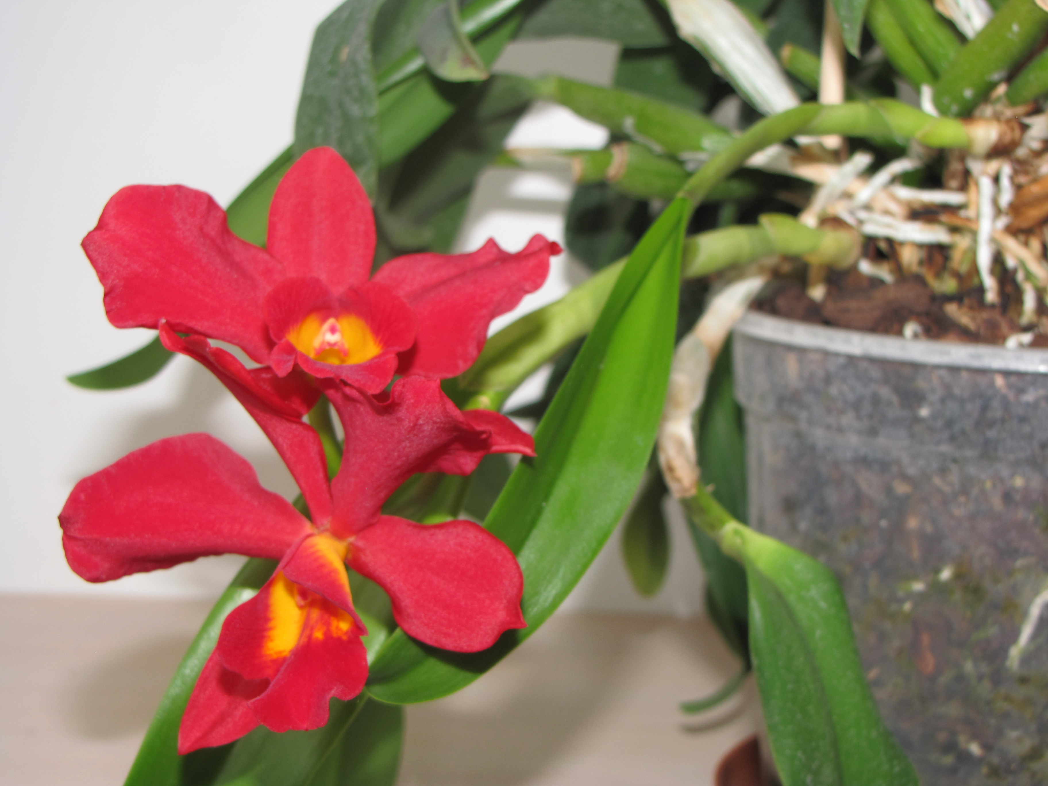 А с этой орхидеей договориться пока не могу. Насколько могу судить - каттлея, у меня она уже лет 6, если не больше, стоит на южном окне, горшок примерно 1,5 л, грунт - рубленая кора. Растёт хорошо, на сегодняшний день 6 точек роста, а вот цветение только из одной, да и то, не каждый год. Поливать стараюсь чаще, чем фаленопсисы, в среднем 3 полива в 2 недели, но ухода ей не хватает, или может подкармливать иногда надо?!
