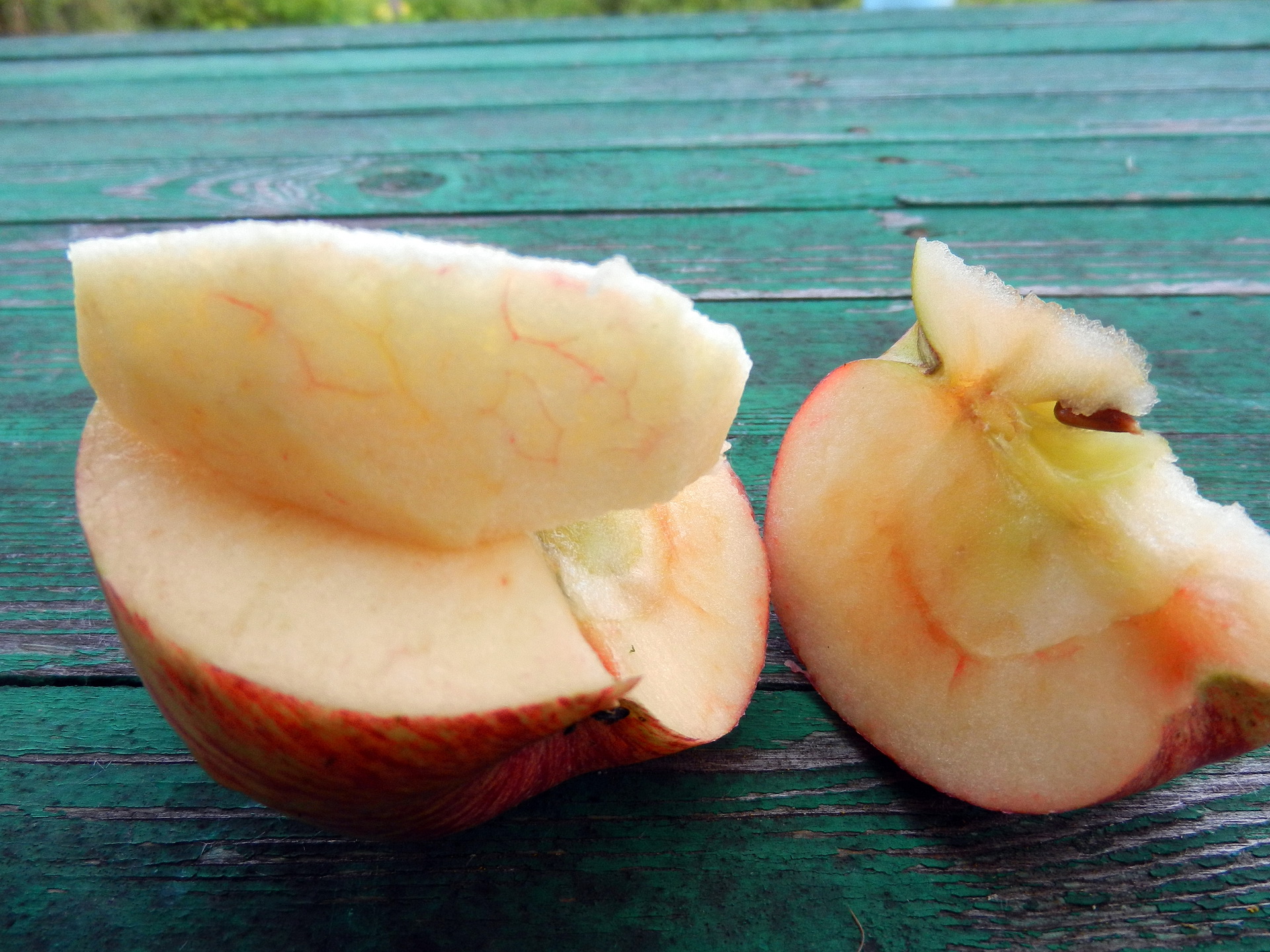 У соседки по даче растёт вот такая яблоня. В нашей зоне в середине августа плоды спелые, раньше сорта Елена, с окрашенными семечками. По весу грамм 140-150. Фото в разрезе нет. Кажется периодичного плодоношения, плоды местами чуть подгнивают на ветке, не более 1-2%. По вкусу близка к Мелбе, может чуть менее насыщенный вкус.