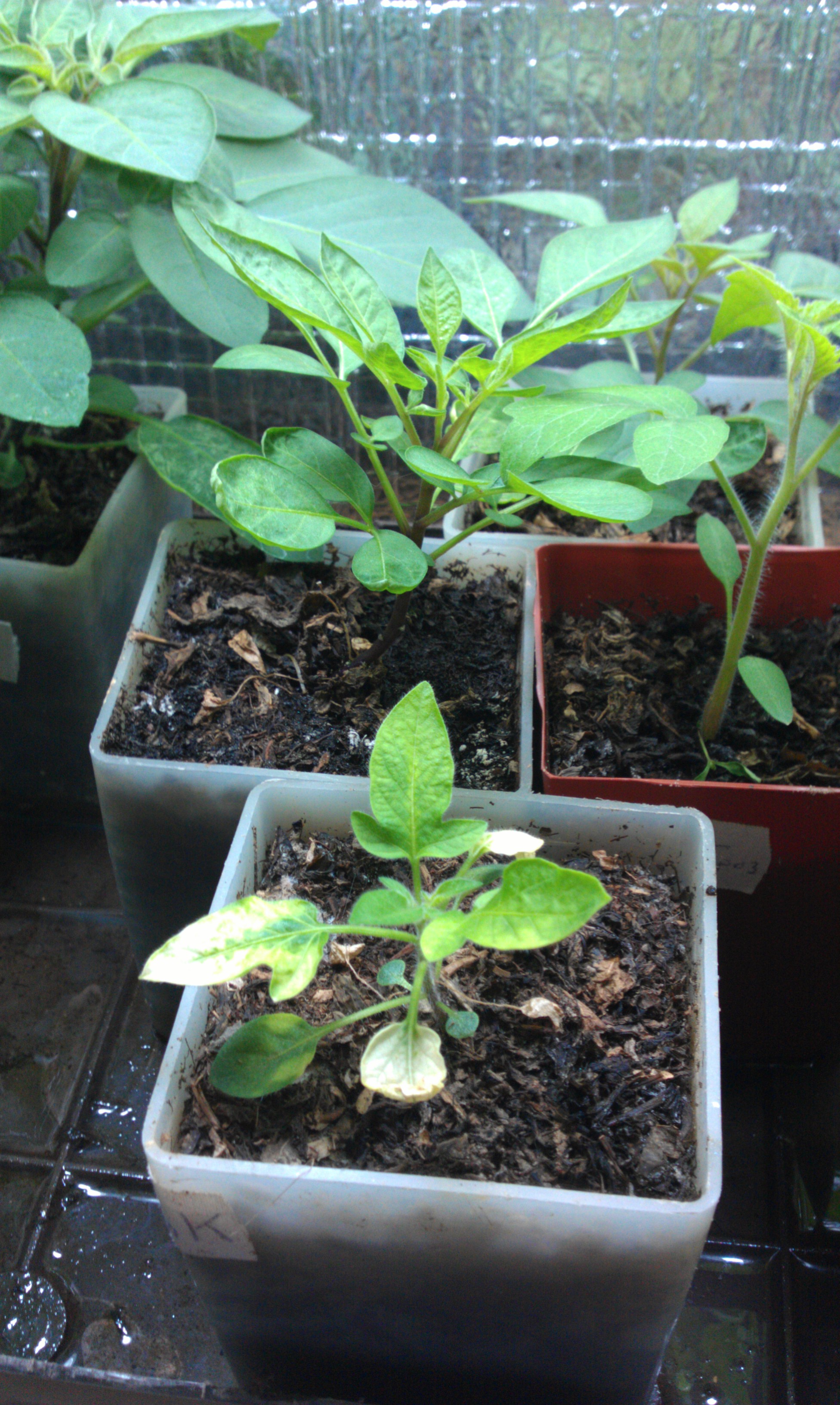 На фото видно, один пепино "Консуэло" уже как куст картошки (хотя дефекты первых листьев заметны), второй "Ромео" тоже