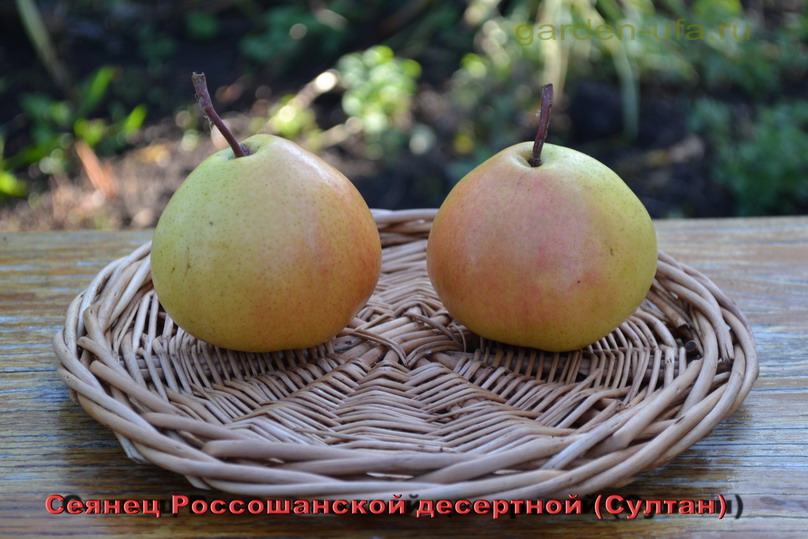 Плоды средней массы (140 г), одномерные, колокольчатые, ребристые, скошенные. Кожица плода грубая, шероховатая, сухая, тусклая. Основная окраска плодов зеленоватая в момент съема и зеленовато-желтая в момент потребительской зрелости. Покровная окраска на половине поверхности плода в виде карминового румянца. Подкожные точки многочисленные, средние, зеленые, хорошо заметные. Плодоножка длинная, толстая, изогнутая, косопоставленная, с толстым наплывом у основания. Воронка мелкая. Чашечка закрытая, неопадающая. Блюдце мелкое, бороздчатое. Сердечко плода небольшое, луковичное. Семенные камеры закрытые. Подчашечная трубка средней длины, коническая. Семена среднего размера, темно-коричневые.