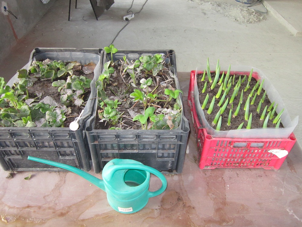 Это ваш эксперимент вырастить землянику зимой? Рядом я так понял стоит ящик с тюльпанами на выгонку ?