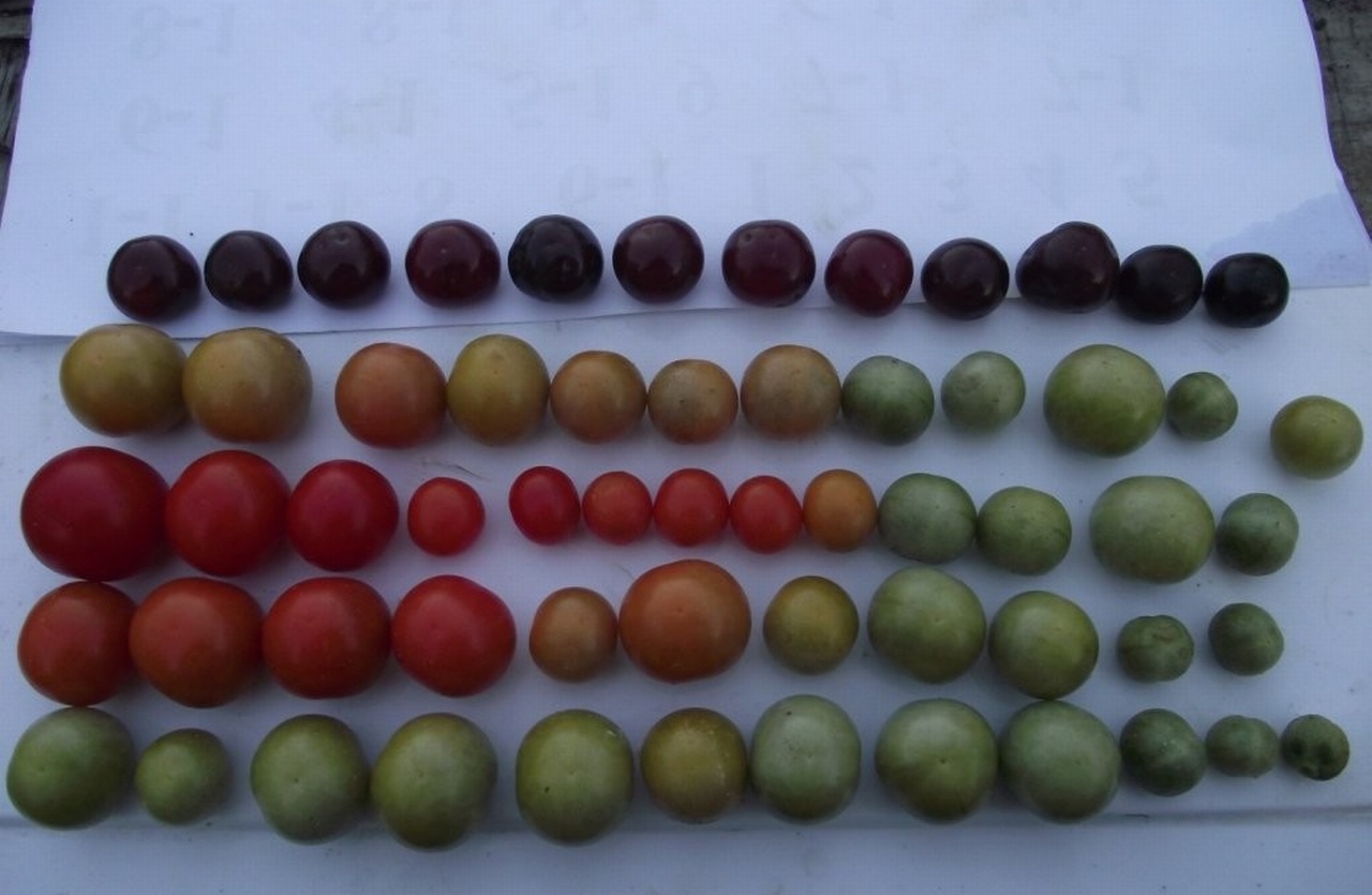 Пришел к выводу, что лучше всего томаты дозариваются в теплице, когда их оставишь на грядках. Ну допустим на пенопласте. А так им надо не ниже +18. Помидоры молочного вида можно спокойно дозаривать на подоконнике на солнышке. Если они еще зеленые, то есть не молочного цвета, лучше в небольшой картонной коробке и положить туда пару зрелых томатов. Процесс этот длительный и лучше купить в магазине гибриды. Они пролежат там 1-1,5 месяца. Естественно надо прикрыть, но чтобы был доступ воздуха. Периодически переворачивать (пролежни). У меня вот таки томаты дозаривались прямо на улице. Это какой то пересорт и пришлось удалить весь куст. Для сравнения в первом ряду ягоды вишни.Кузинамама писал(а):А снятые зелеными где до покраснения должны лежать? Имеет значение - на свету, в тепле-холоде?