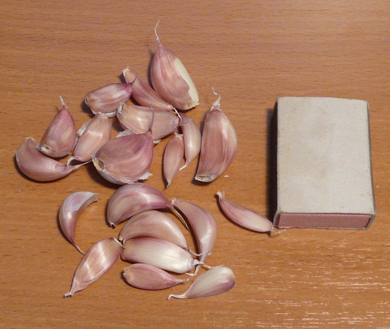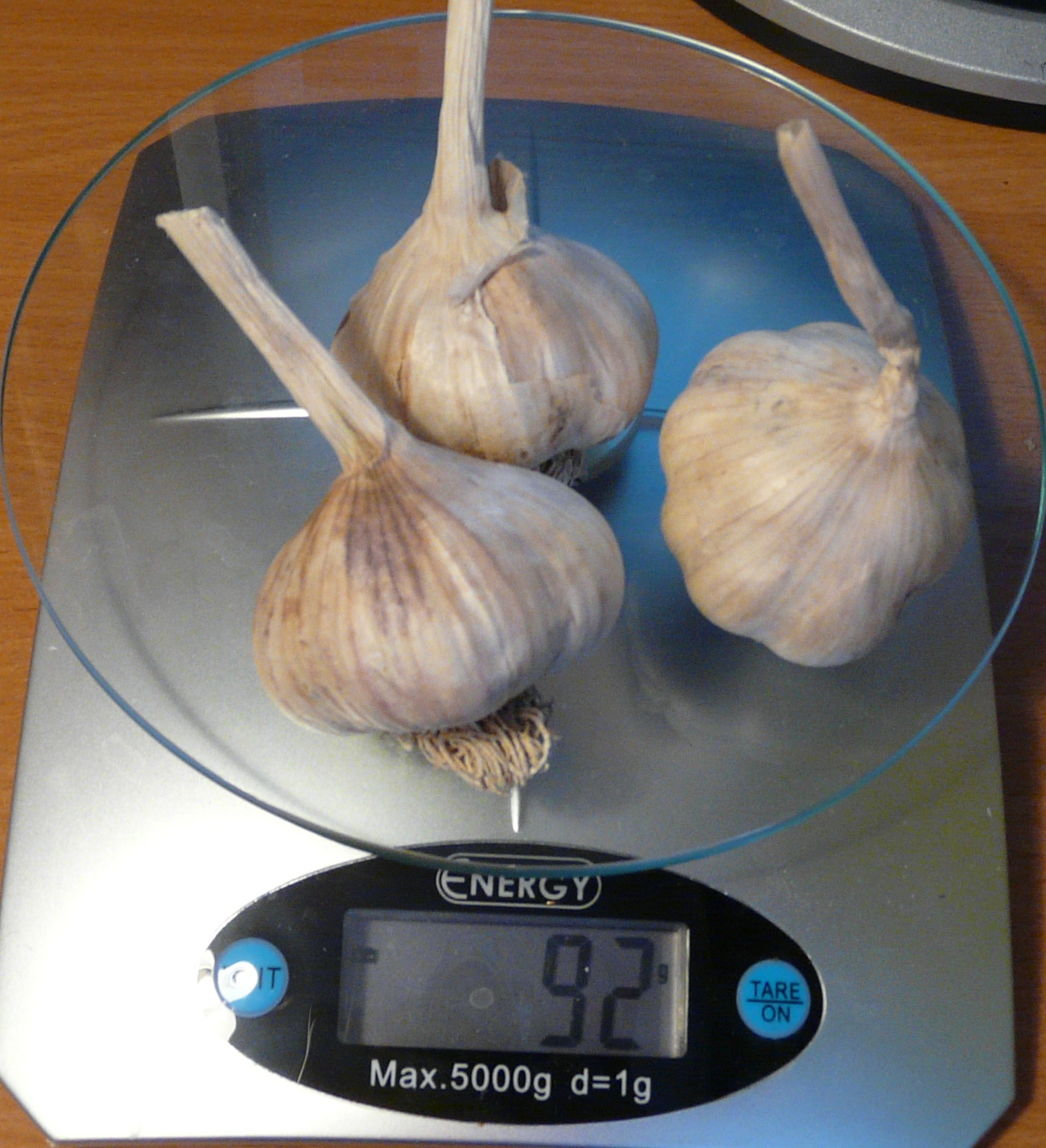 Вот опять сфоткала чеснок. Средний вес головки 30 грамм, распотрошила одну головку - там 20 зубчиков.