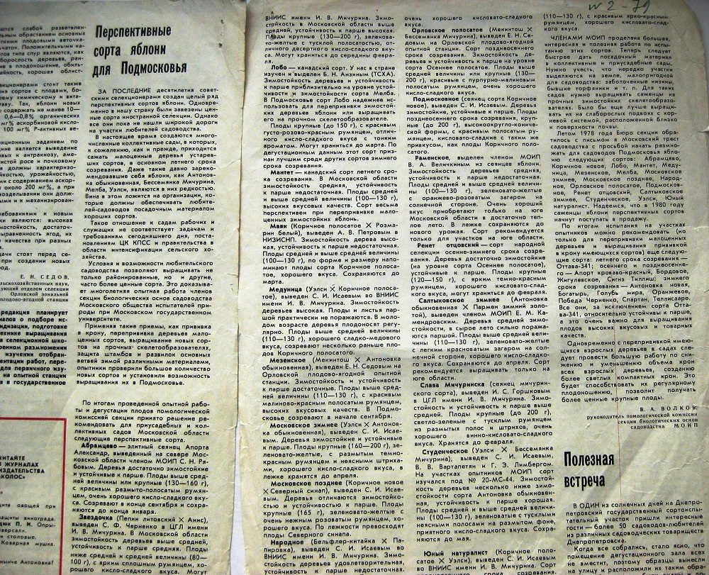Уважаемый Александр (FatMax), в далекие 70 годы МОИП был в авангарде продвижения сортов плодово-ягодных культур и винограда, а также технологий возделывания их в сады садоводов –любителей. Материалы МОИПа печатались во Всесоюзных изданиях (журнал Садоводство), статьи членов МОИПа печатались в сборниках, издаваемых издательством Московский рабочий в популярных сериях. И это считалось нормой. Имена Камендровского Е.М., Комиссарова М.П., Кирпичникова В.А. знали многие садоводы Подмосковья. Сорта яблони, выведенные этими опытниками до сих пор можно встретить в любительских садах, а сорт Зимняя красавица вновь становится очень популярным среди садоводов любителей. Книга Е.М. Камендровского Прививка и перепрививка плодовых деревьев очень популярна среди садоводов и издавалась неоднократно и сегодня в пиратских копиях присутствует в интернете. А чем могут похвастаться современные МОИПовцы? Вы попытались рассказать на форуме о работе помологической комиссии МОИПа и это было здорово, но надолго Вас не хватило, Вы опять скрылись за местническим амбициями, вместо того чтобы широко использовать возможности интернета для популяризации деятельности МОИПа по испытанию новых сортов в любительских садах , ускорению их внедрения. Для примера работы Ваших предшественников привожу статью В.А. Волкова, руководителя помологической комиссии секции биологических основ садоводства МОИП, опубликованную в журнале Садоводство №2 за 1979гFatMax писал(а):