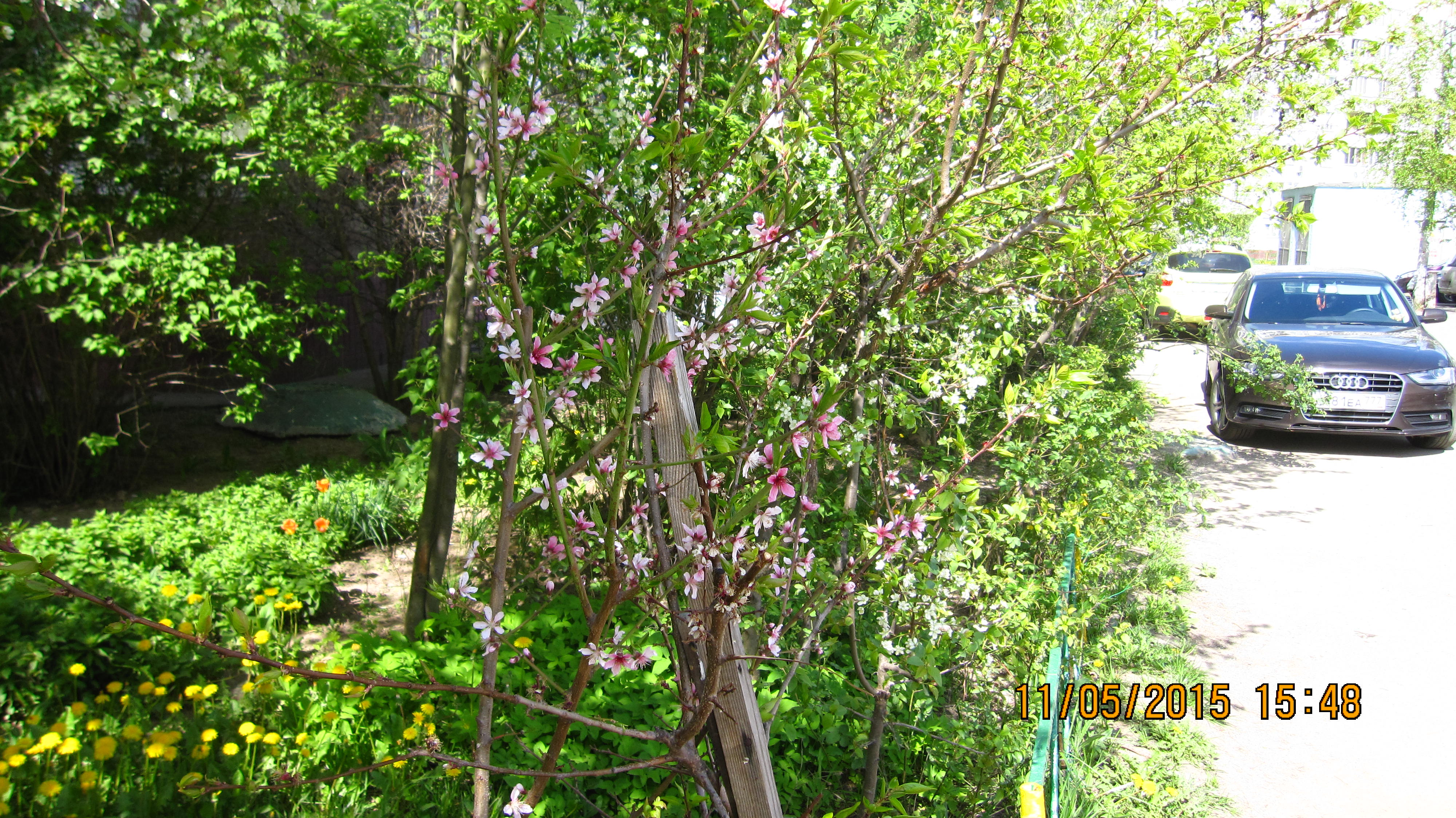 Персик Хасанский от Железова(Саяногорск), прививка 2011г. на поросль сливы .Москва рн. Митино. Ничем не укрывал. Цветет уже три года, плоды созрели первый год, все съели прохожие. 9 Мая кто то умный выкопал рядом пару цветущих абрикосов.