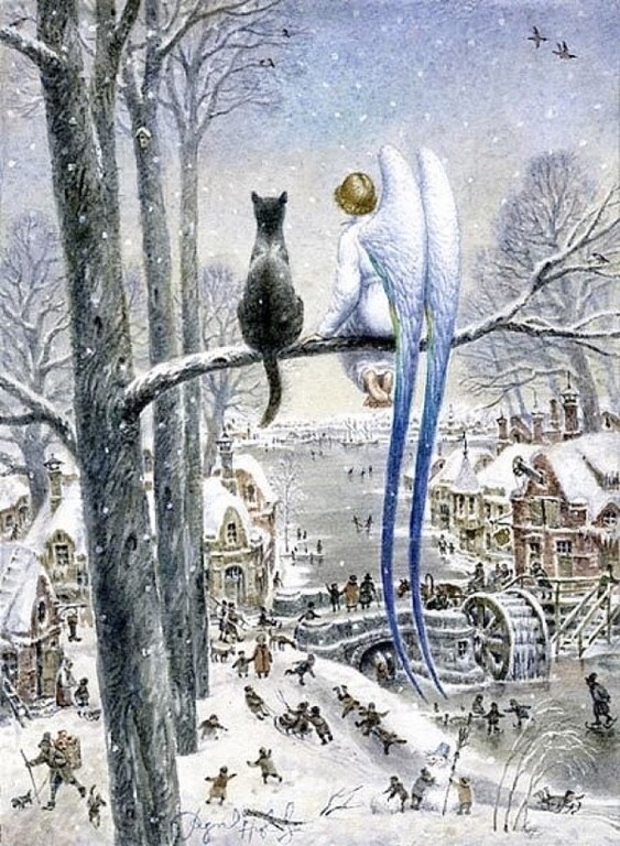 – Привет, – Кот приоткрыл зелёный глаз, лениво оглядел Ангела и отвернулся. Ангел спрятал под крыльями босые ноги и посмотрел вниз. Под ними лежал белый двор, полный смеха, визга, летающих снежков и скрипа шагов.