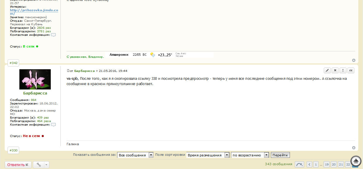 va-spb, После того, как я я скопировала ссылку 330 и посмотрела предпросмотр - теперь у меня все последние сообщения под этим номером. А ссылочка на сообщение в красном прямоугольнике работает.