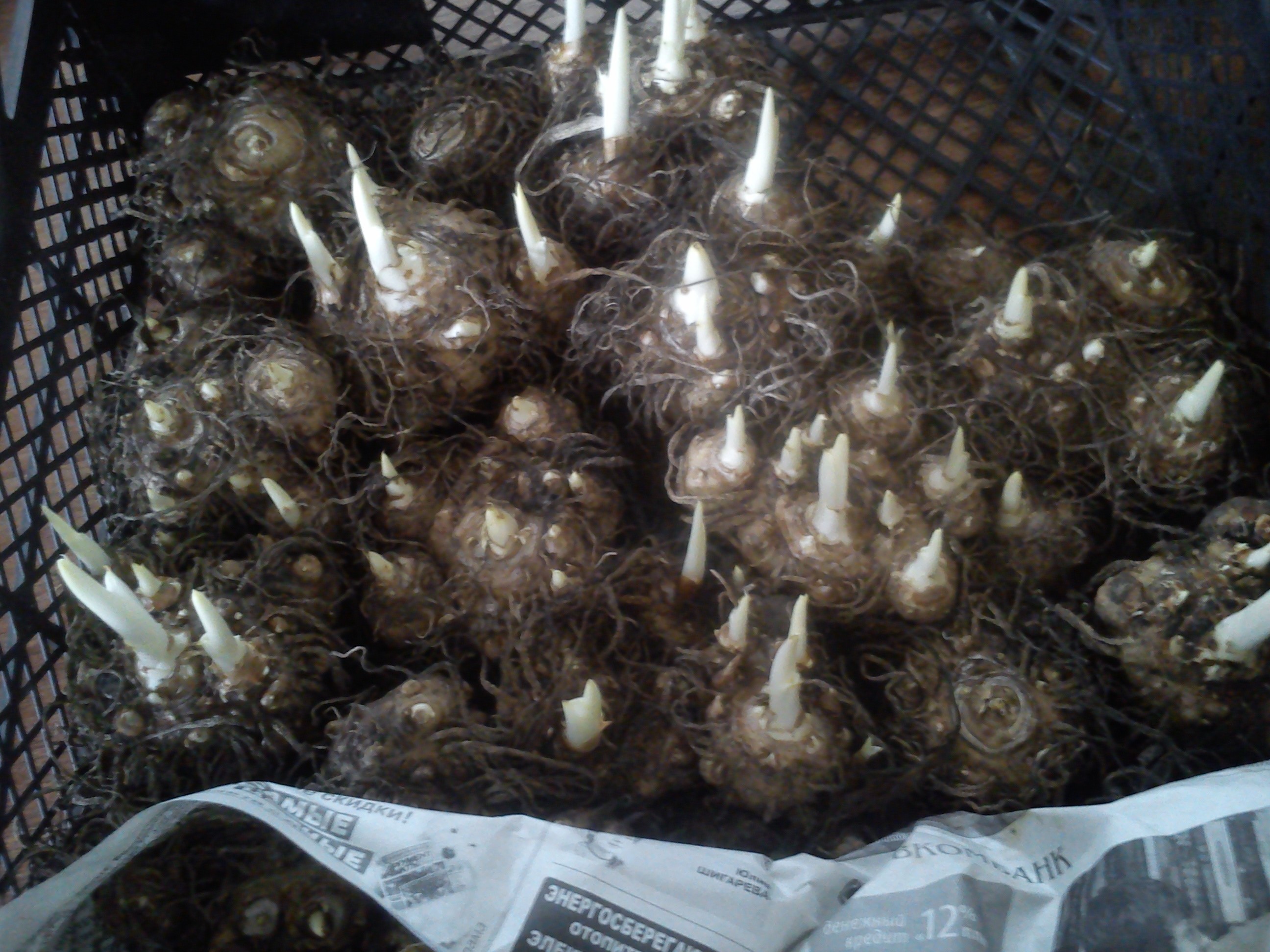 Я свои каллы храню в пластиковой корзине, в прохладном тёмном месте(подвале) при 7-10 градусах. Чтобы хорошо хранились осенью после выкопки тщательно промываю корни от земли и долго сушу, пока ботва и корни не завянут и не начнут отваливаться от клубней. Повреждённые клубни с трещинками как правило загнивают, я их отбрасываю, т.к. у меня их много и нет необходимости за них бороться. К весне они просыпаются в марте и начинают прорастать. Это не страшно, я их специально не подращиваю( слишком много их), а сажаю сразу в ОГ в конце мая. Поэтому с ростками их высаживать лучше, быстрее в рост пойдут. Цветут все крупные луковицы. Перед посадкой стараюсь семейки поделить по возможности. Места разломов обрабатываю древесным углём и подсушиваю. Если не делить, то цветут хуже.