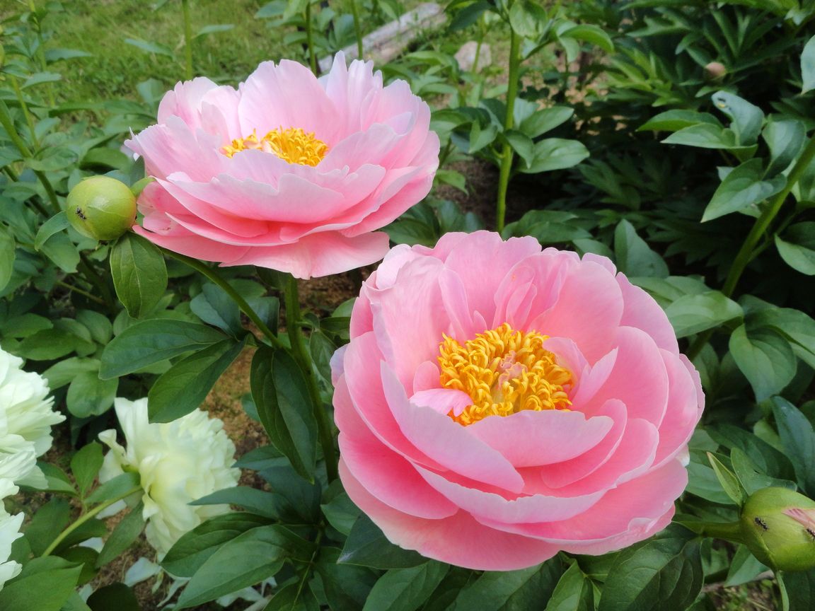 Еще Фестива Максима и Корал Сансет первые бутоны. Корал Сансет на высоких мощных стеблях зреют большие бутоны, похожие на мячики. Боковые бутоны тоже есть