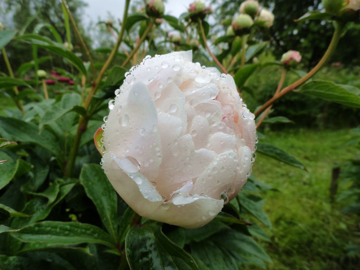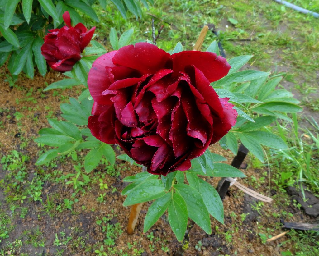 Харвард для второго года еще не набрал истинный размер, не достиг хорошего уровня. Опять два цветка, но они больше по размеру. Цвет классный, он близкий к Бакай Белль, они стоят почти рядом, но закрываются по-разному. Харвард вечером и в непогоду закрывается плотно складывая лепестки и дождь не страшен. Стебель с листьями пока не в лучшей форме, он прочный, но не такой ровный как хочется, это скорее всего пройдет со временем. В общем он развивается медленно и верно, на болезни не реагирует и паразиты его не сильно повредили. Погрызли один стебель, но ранка зажила сама. В результате цветок меньше и рост несколько меньше.