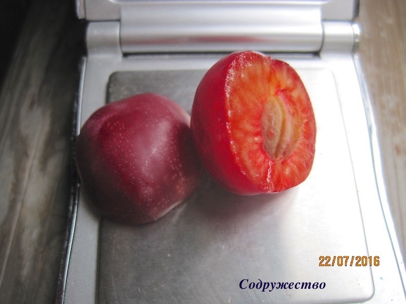 Кожица тонкая, мякоть сочная, плотная с хорошо заметными прожилками. Косточка у 2х плодов из трех имевшихся в наличии