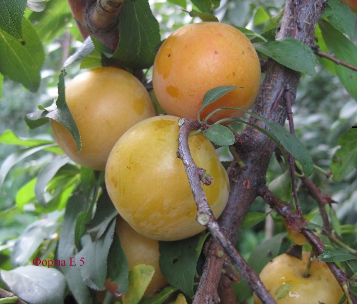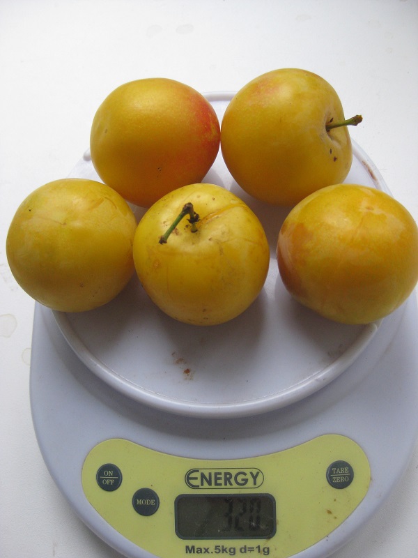 Второй год плодоносит в прививках на сливе домашней. Плодоношение чрезмерно обильное, размещение плодов на ветви очень плотное, что приводит к преждевременному загниванию их и опадению. Плоды не выравненные по размеру и массе., Редко расположенные плоды массой более 60г, при более плотном размещении по длине ветви масса плодов колеблется от 25 до 50г. Окраска плодов желтая. Отдельные авторы отмечают, что окраска золотистая. На солнечной стороне плоды имеют карминный румянец примерно на треть плода. Кожица тонкая, плотная, слабо отделяющаяся от мякоти. Косточка сросшаяся с мякотью. Мякоть плотная, несколько хрящеватая, желтого цвета, очень сочная. Вкус десертный, с очень приятным балансом кислоты и сахара, в послевкусии ощущается привкус абрикоса. Плоды очень сильно повреждаются осами и мухами. При созревании плоды осыпаются.
