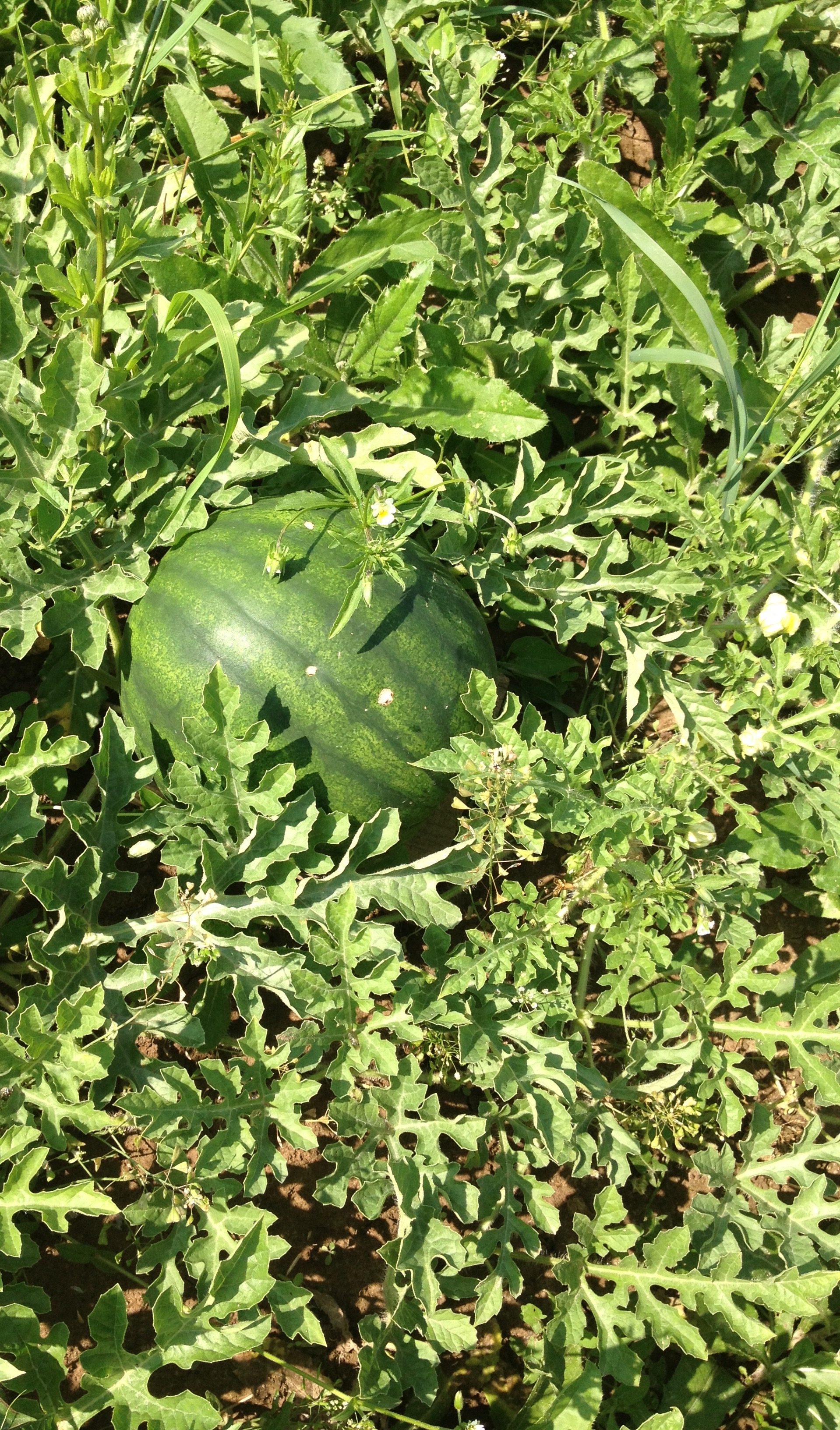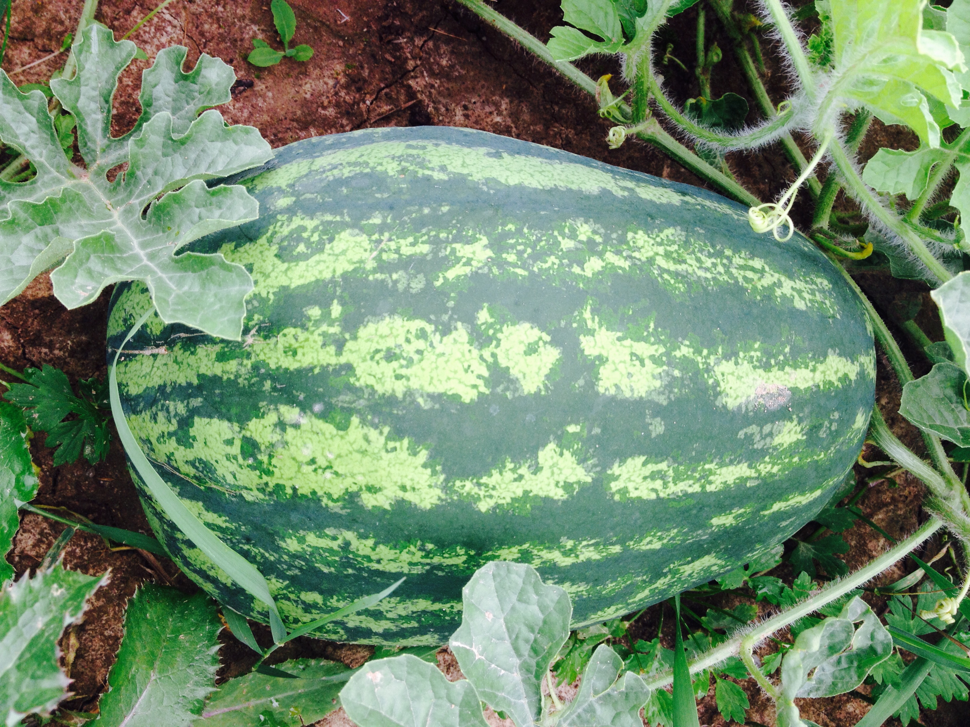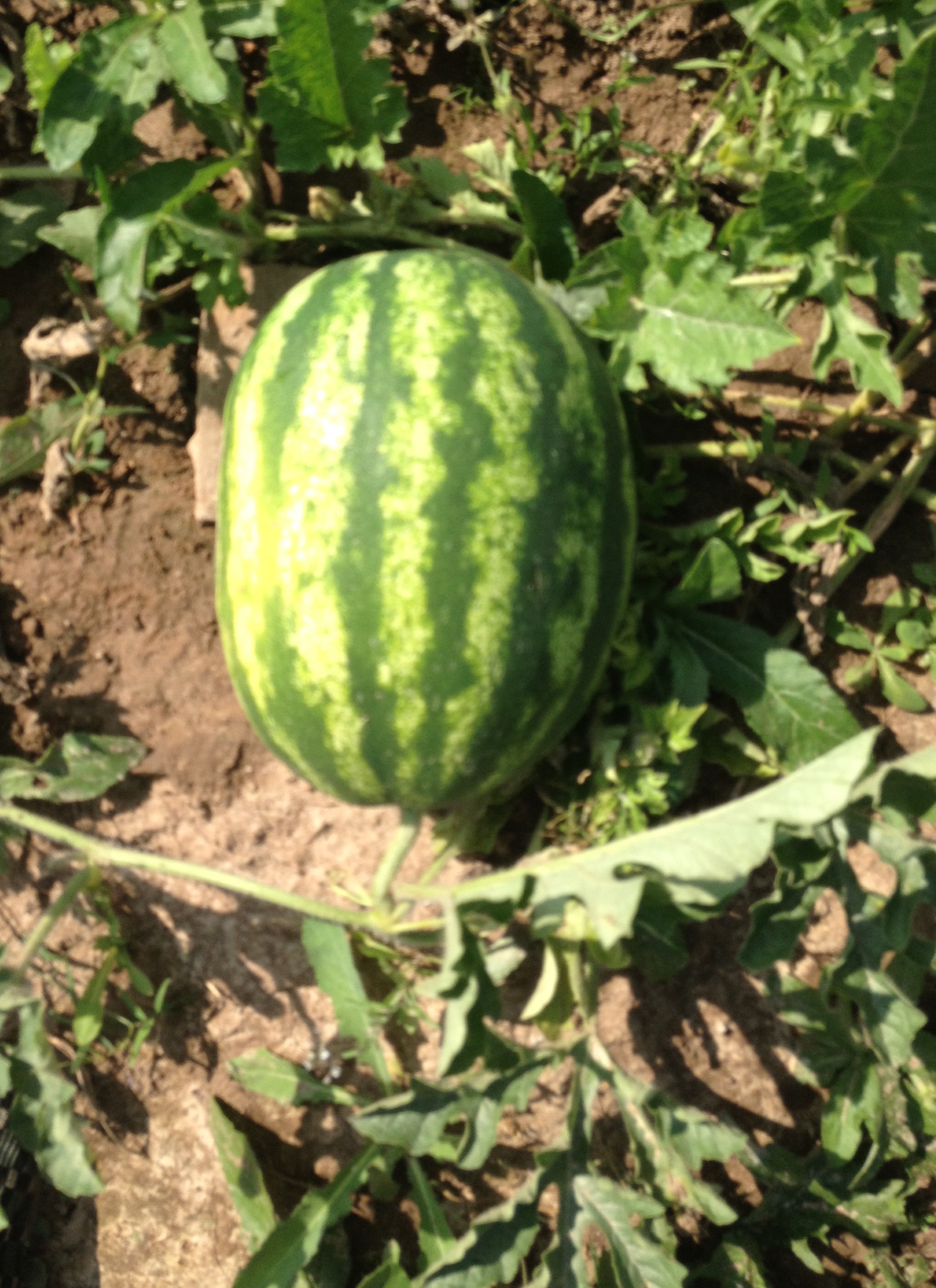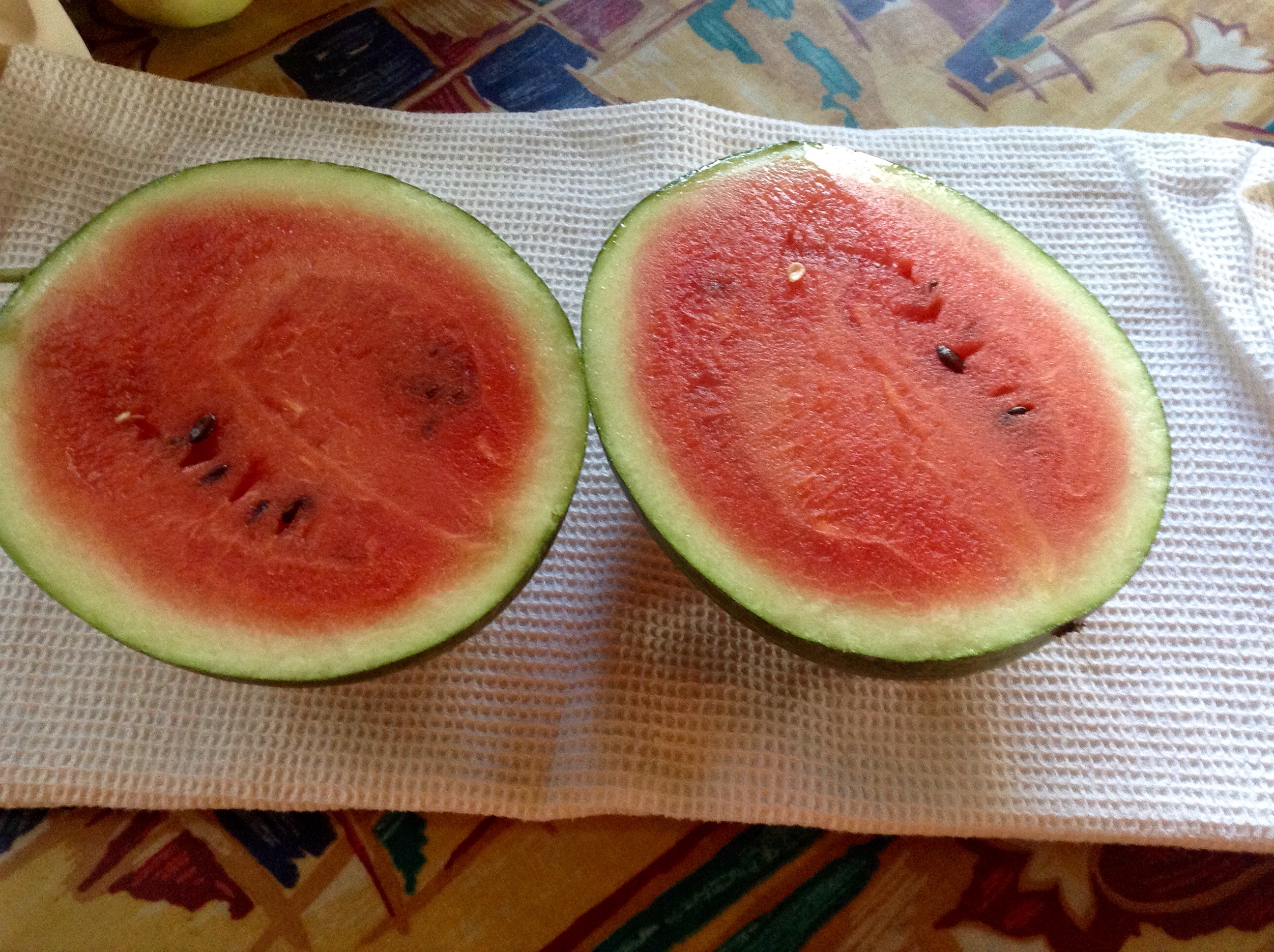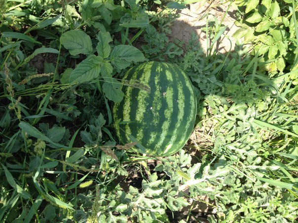 А у меня треснул арбузик Пони ело, пришлось сорвать. Размер смешной (ручка для сравнения), взвесить забыла, но сладкий, сочный...