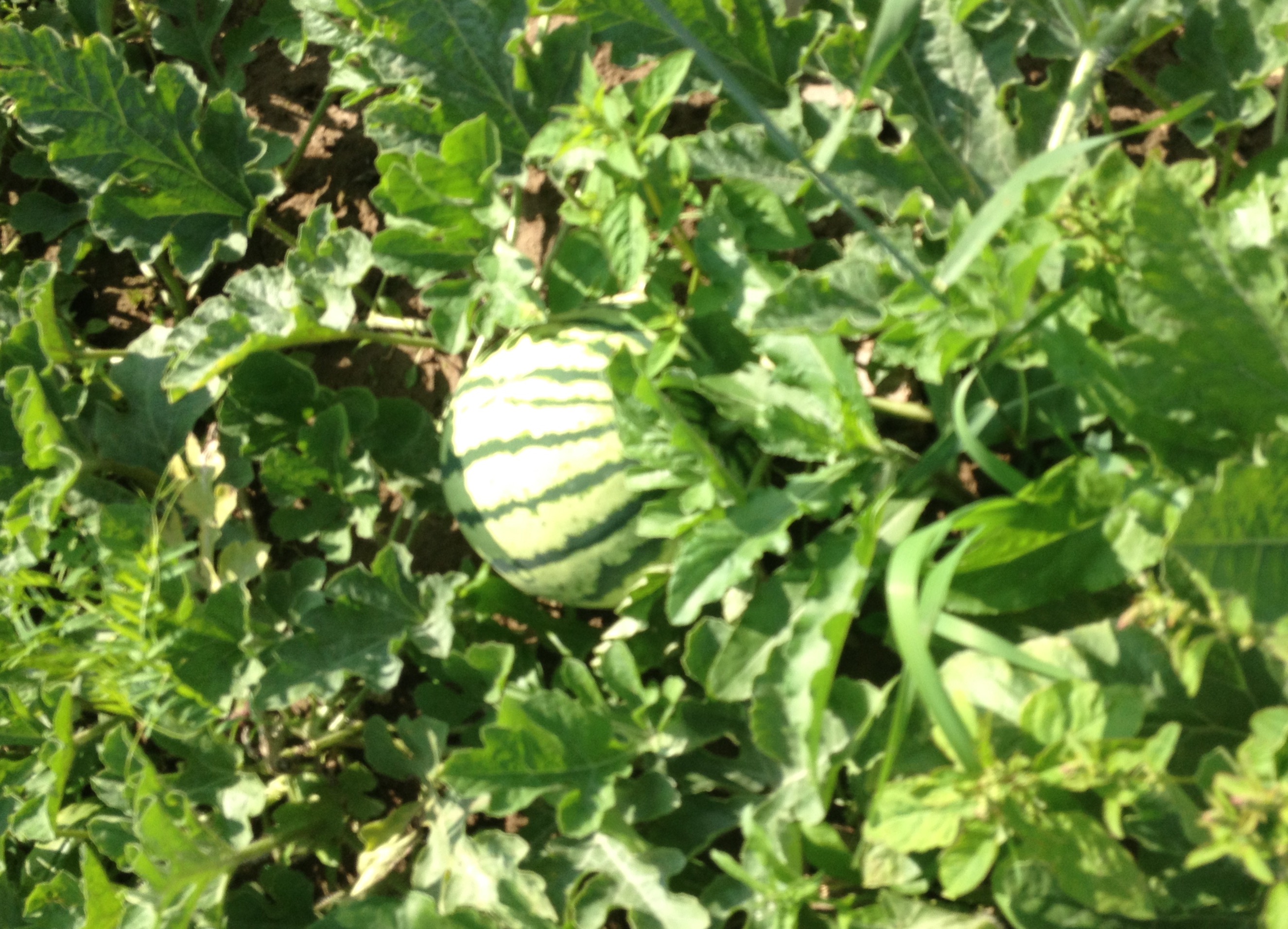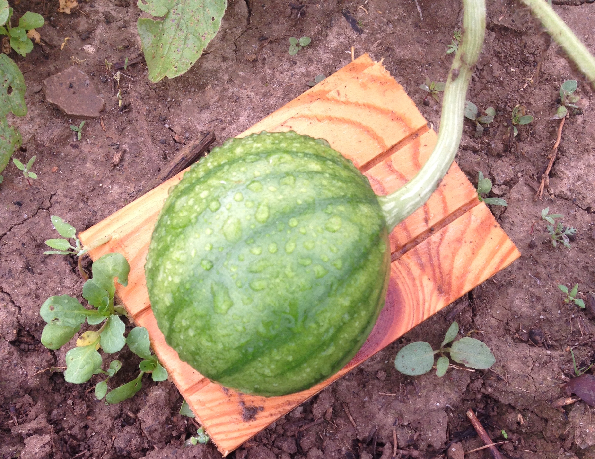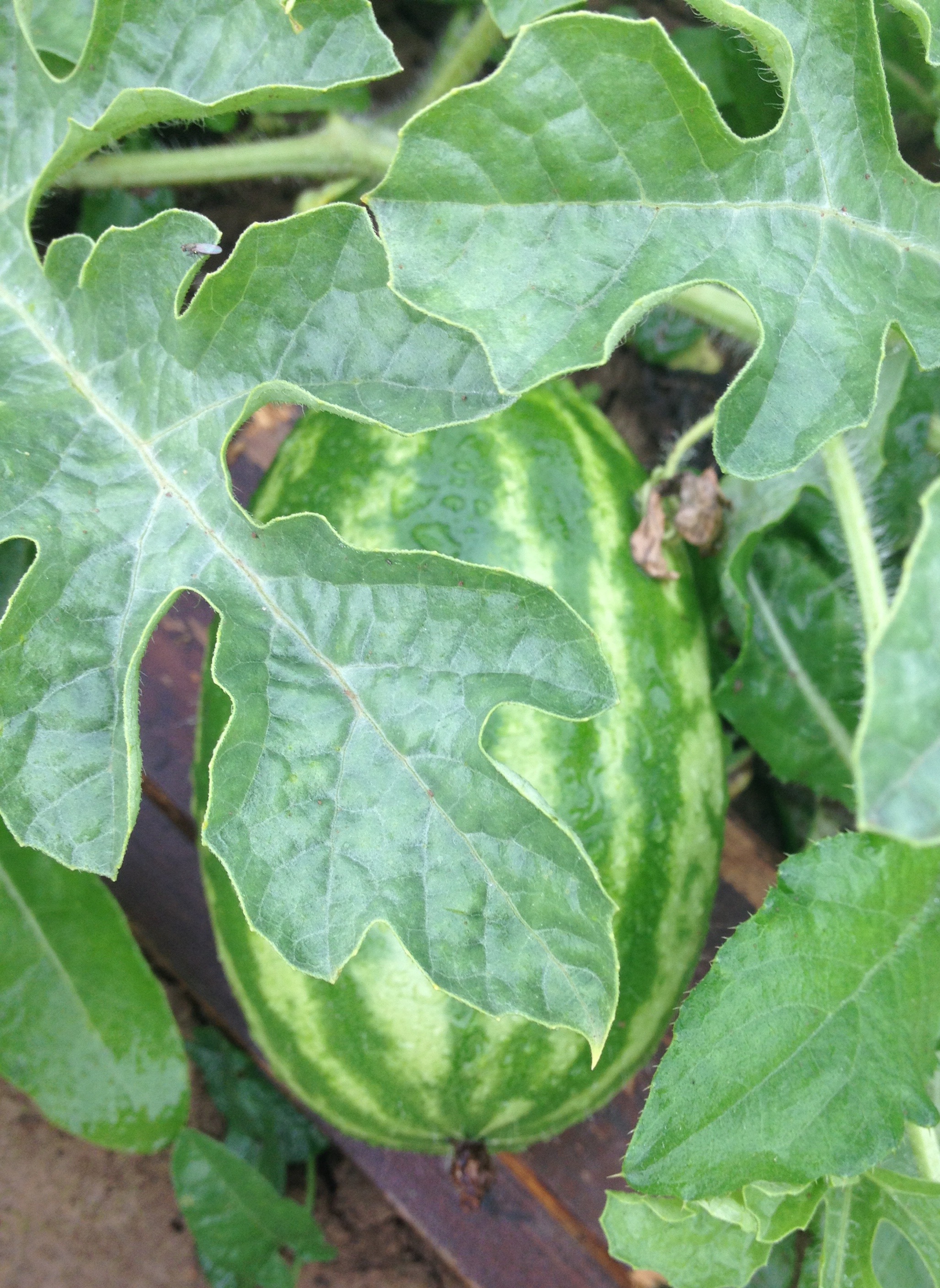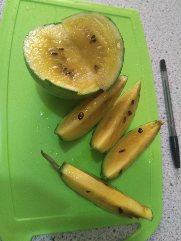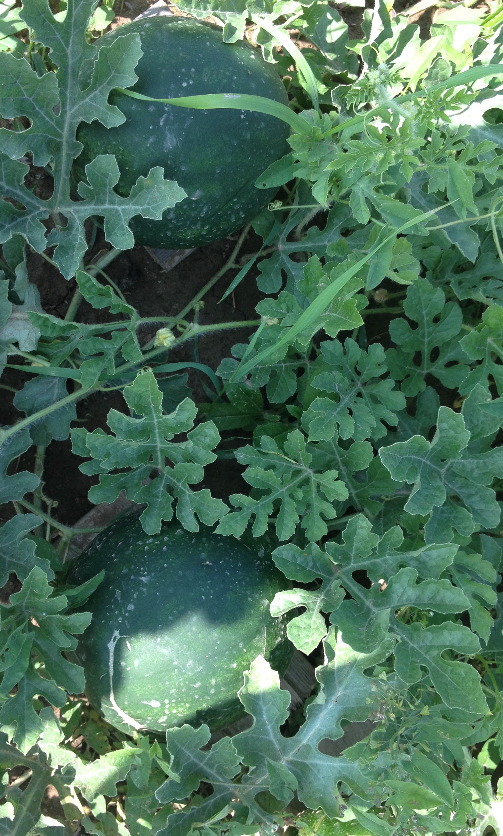 А у меня треснул арбузик Пони ело, пришлось сорвать. Размер смешной (ручка для сравнения), взвесить забыла, но сладкий, сочный...