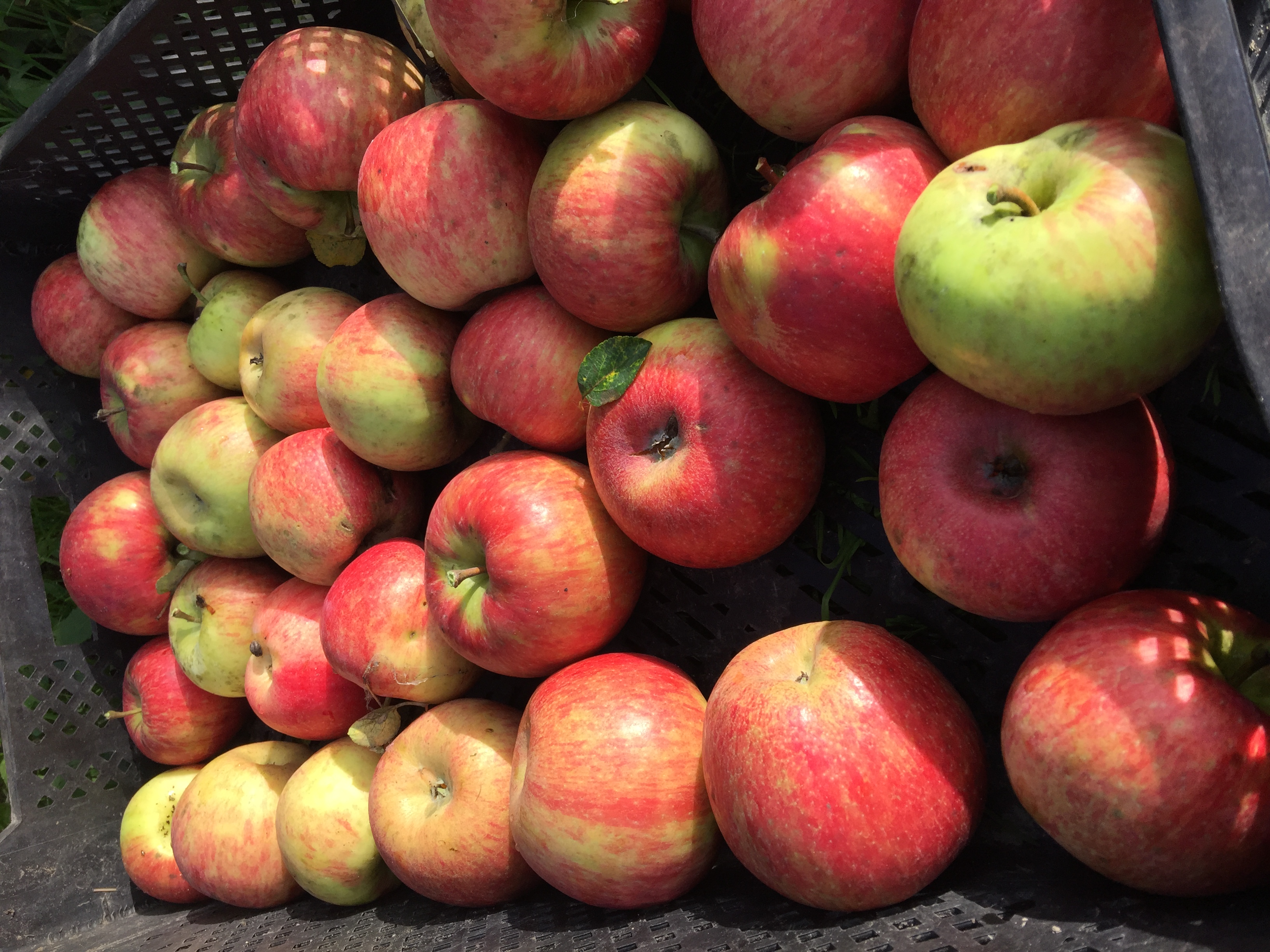 Сегодня собрали Хани Крисп. Нарядные, очень сочные.Висят на дереве очень прочно, ни одно яблоко не упало( по сравнению с нашими сортами, которые, после ураганного ветра, все осыпались неделю назад) Оставили немного с северной стороны, где плоды побледнее, пусть повисят еще, жалко все обрывать. Ямчатости вроде нет, она появляется на плодах к концу весны при хранении в погребе, к маю.