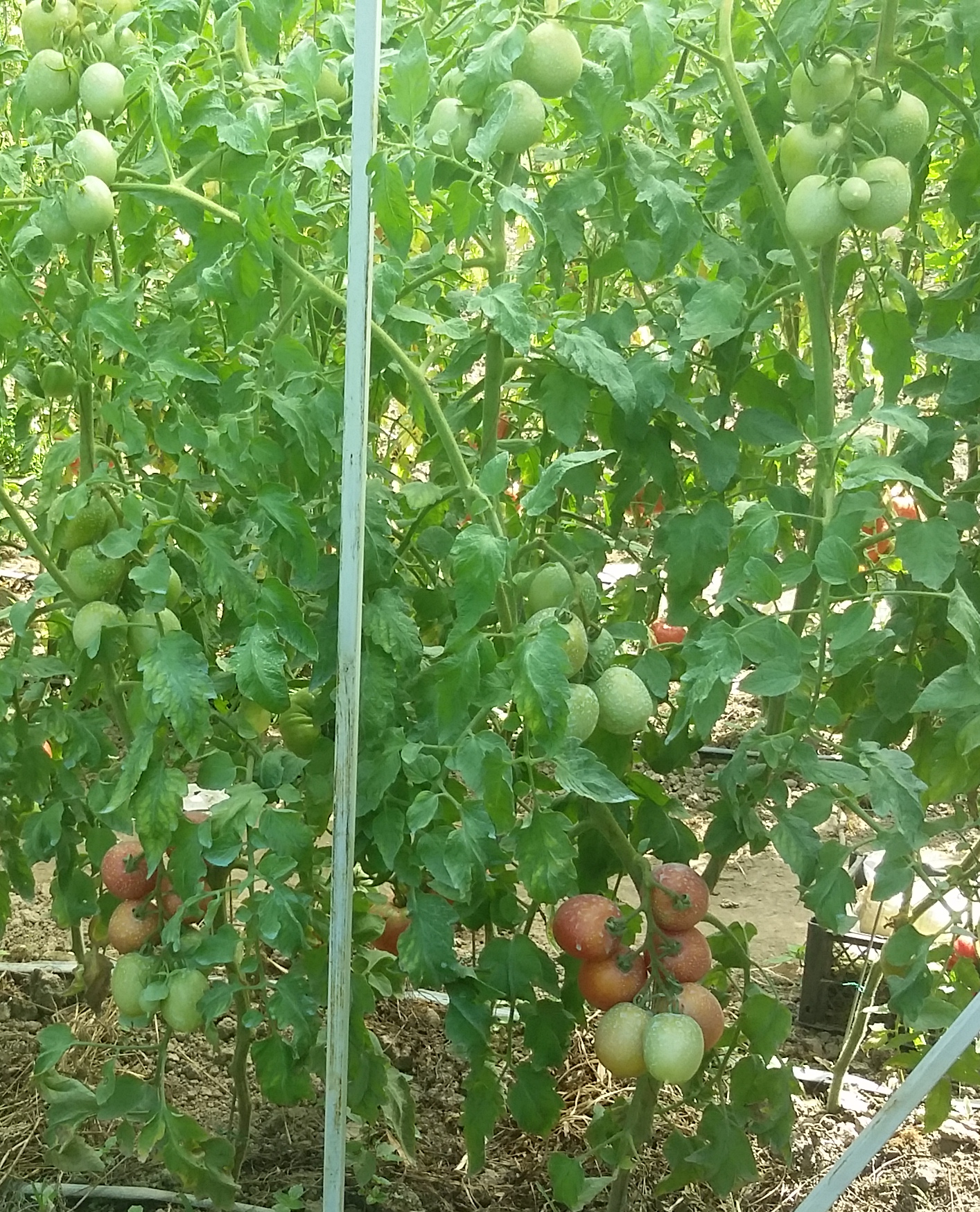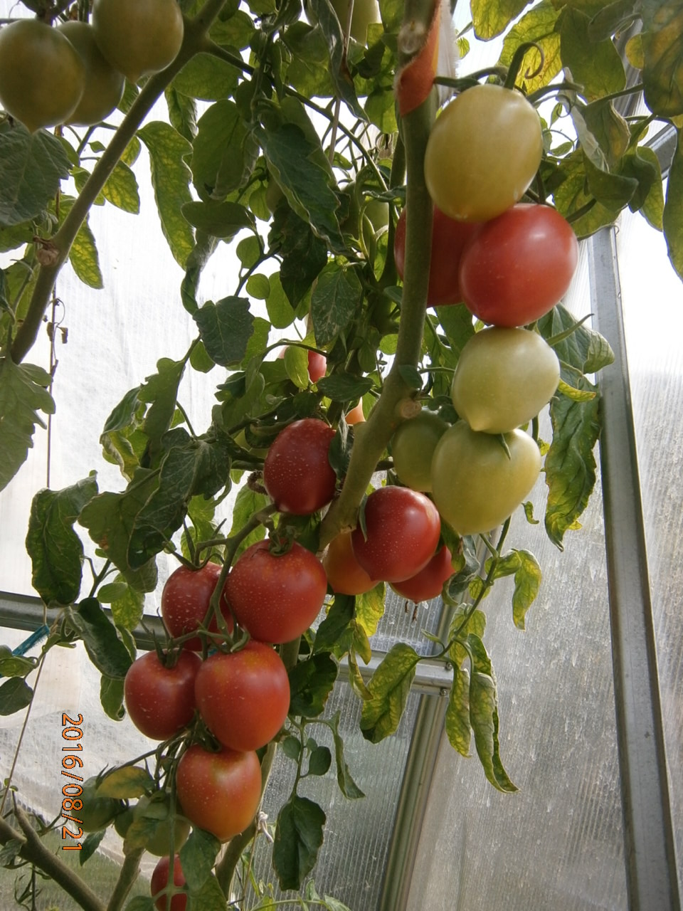 У соседки росли два куста по центру теплицы в конце у окна ( дверей там не было). Рядом росла черешня за теплицей. В тени получились длинные междоузлия, вязать стала поздно.Я - Татьяна