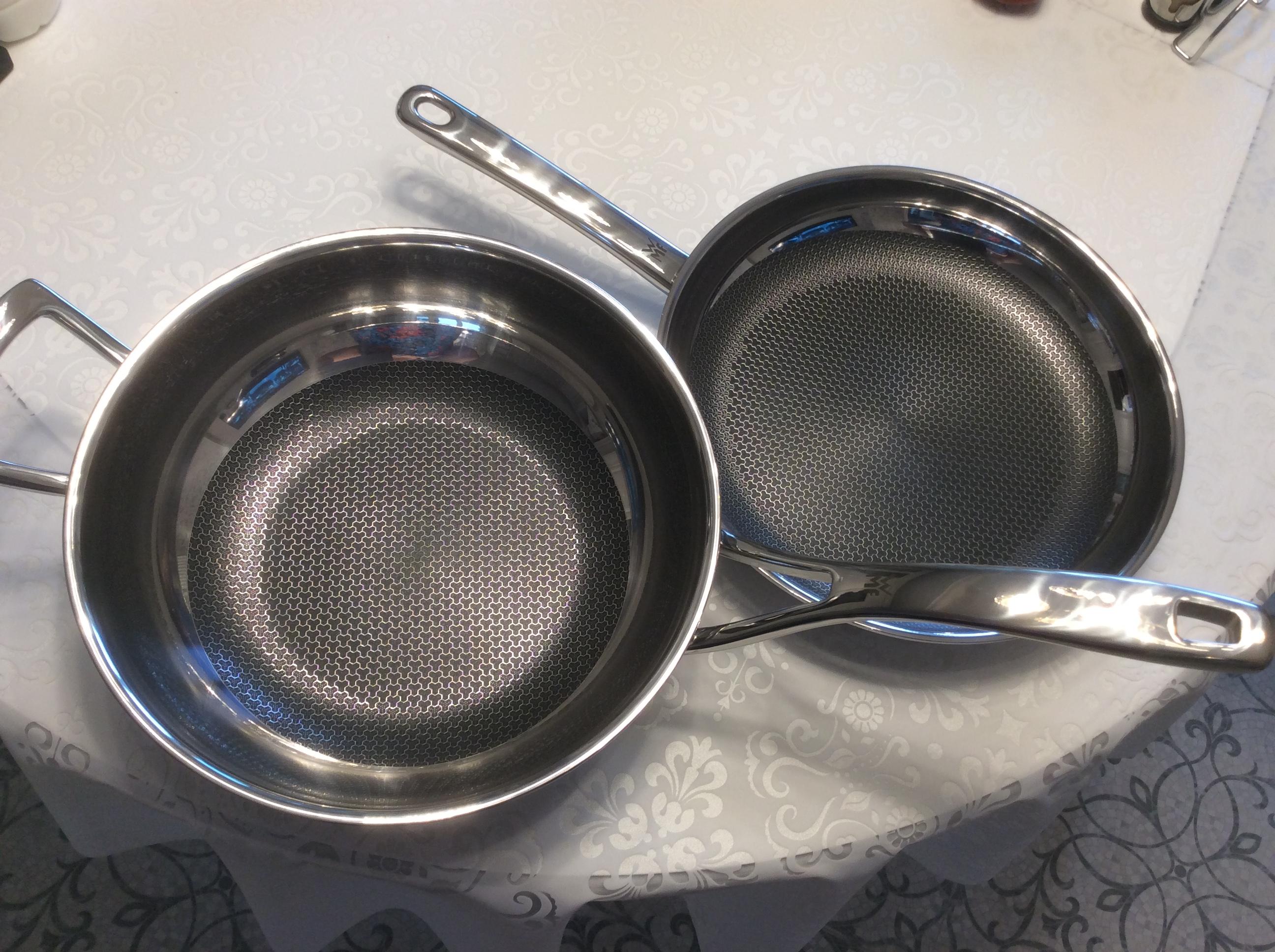 У сковородок соты такие интересные на дне, просто сковорода и глубокая сковорода (вок). Кастрюли хорошие, быстро закипают, а сковородки здоровенные и тяжеленные жуть.