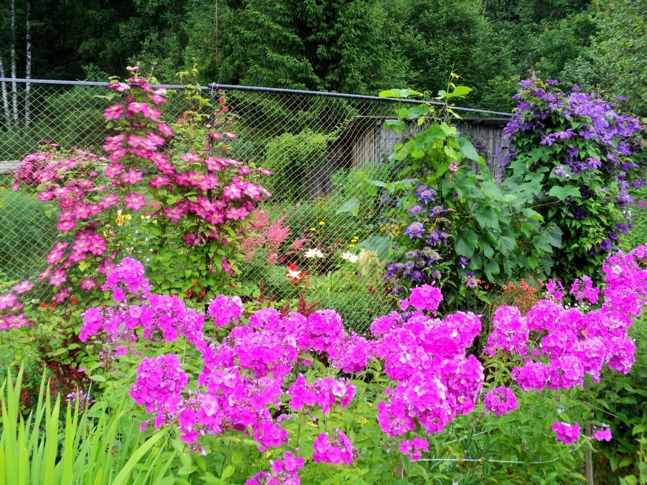 4 плетистых розы, 4 клематиса, 3 гортензии, мелочь в виде флоксов и лилий не считаю. Весселье еще -то
