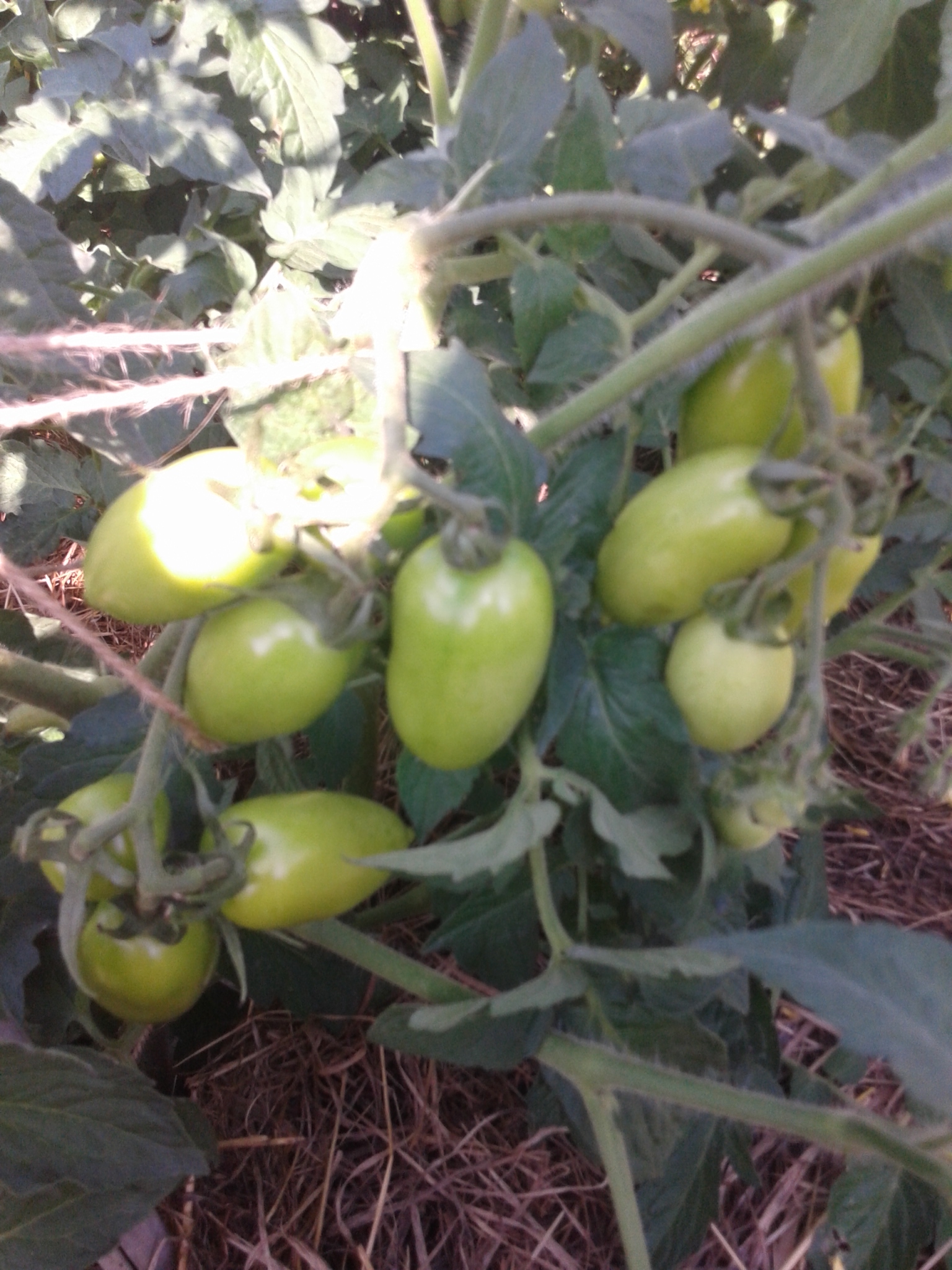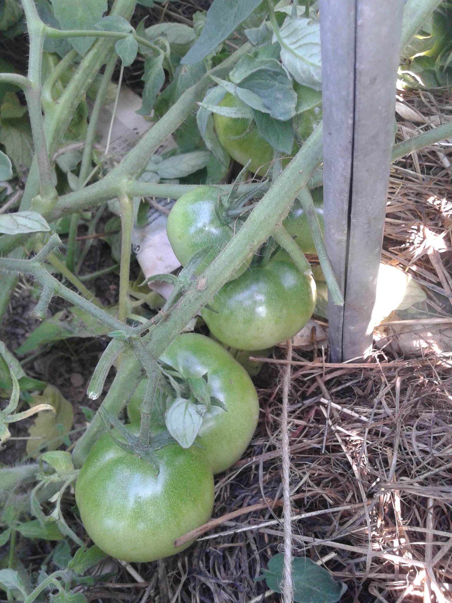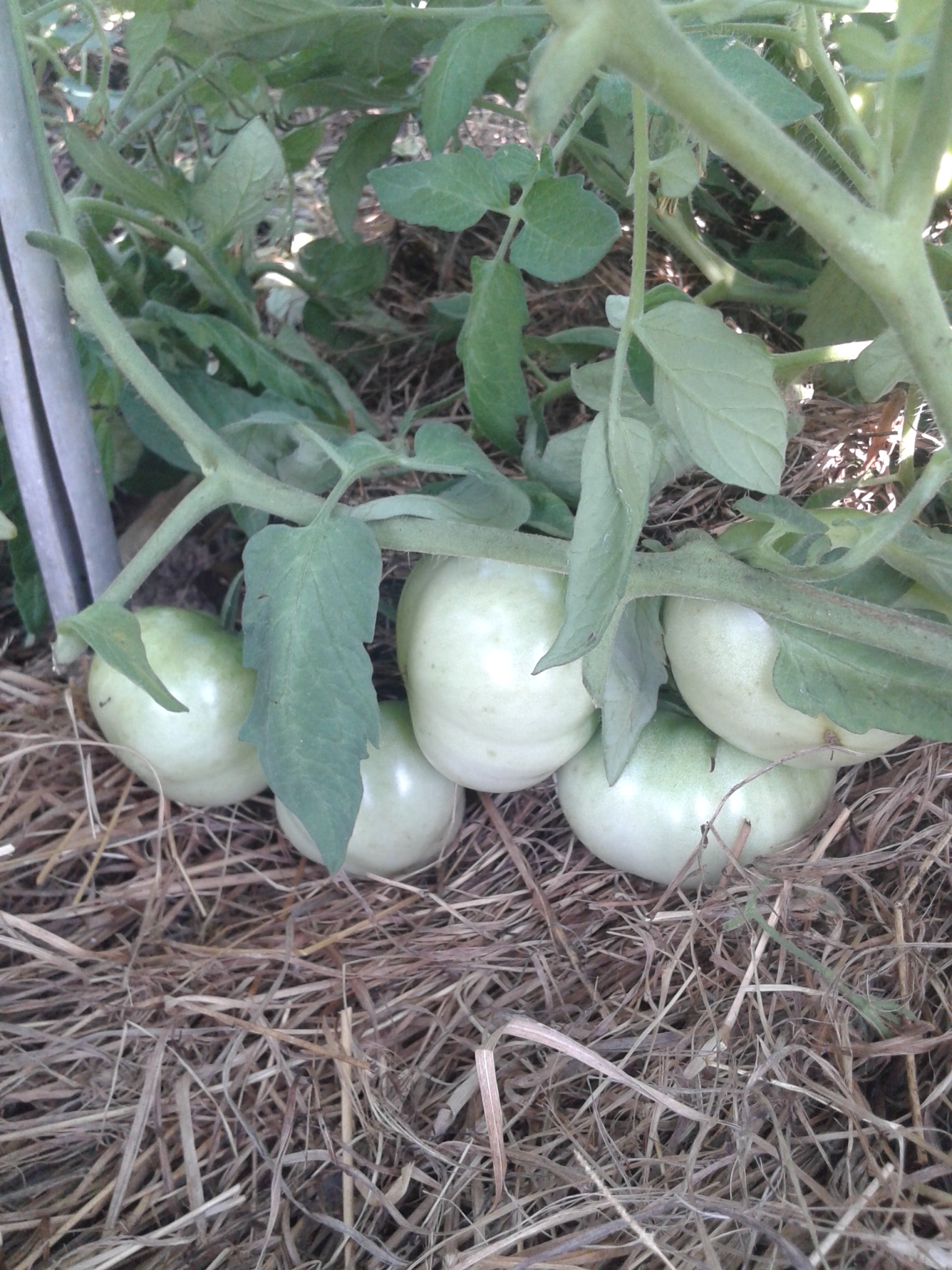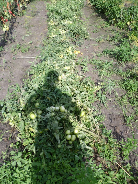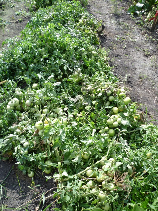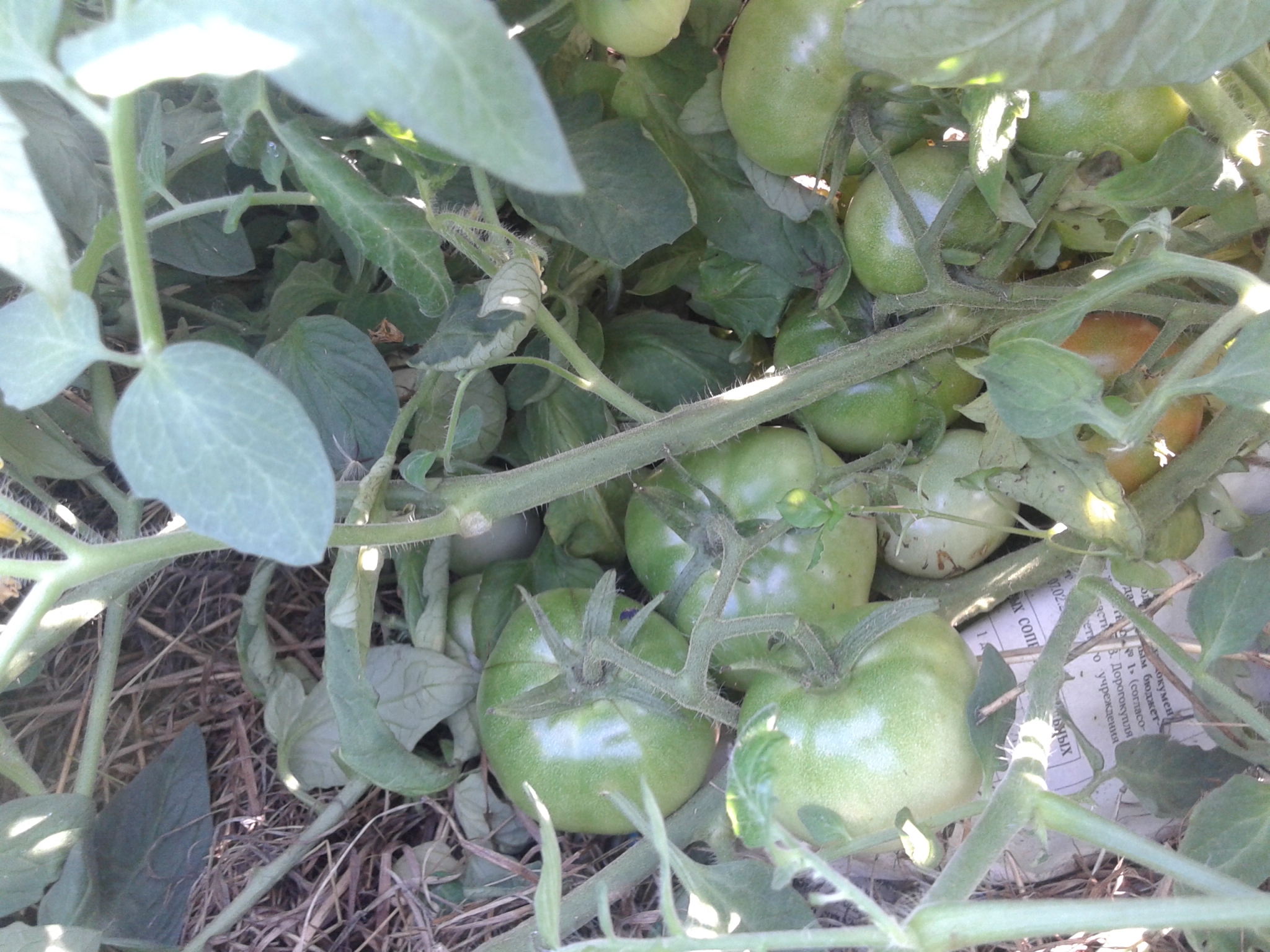 Растут в ОГ, в растил по сену, а под сеном газета. Усеян томатами - один к одному, даже сорвать спелый - целая проблема - не подлезешь, ни снизу, ни сверху, всё так кучно. Вот фото зеленых (спелые сняли. а потом опомнились что надо сфотать: