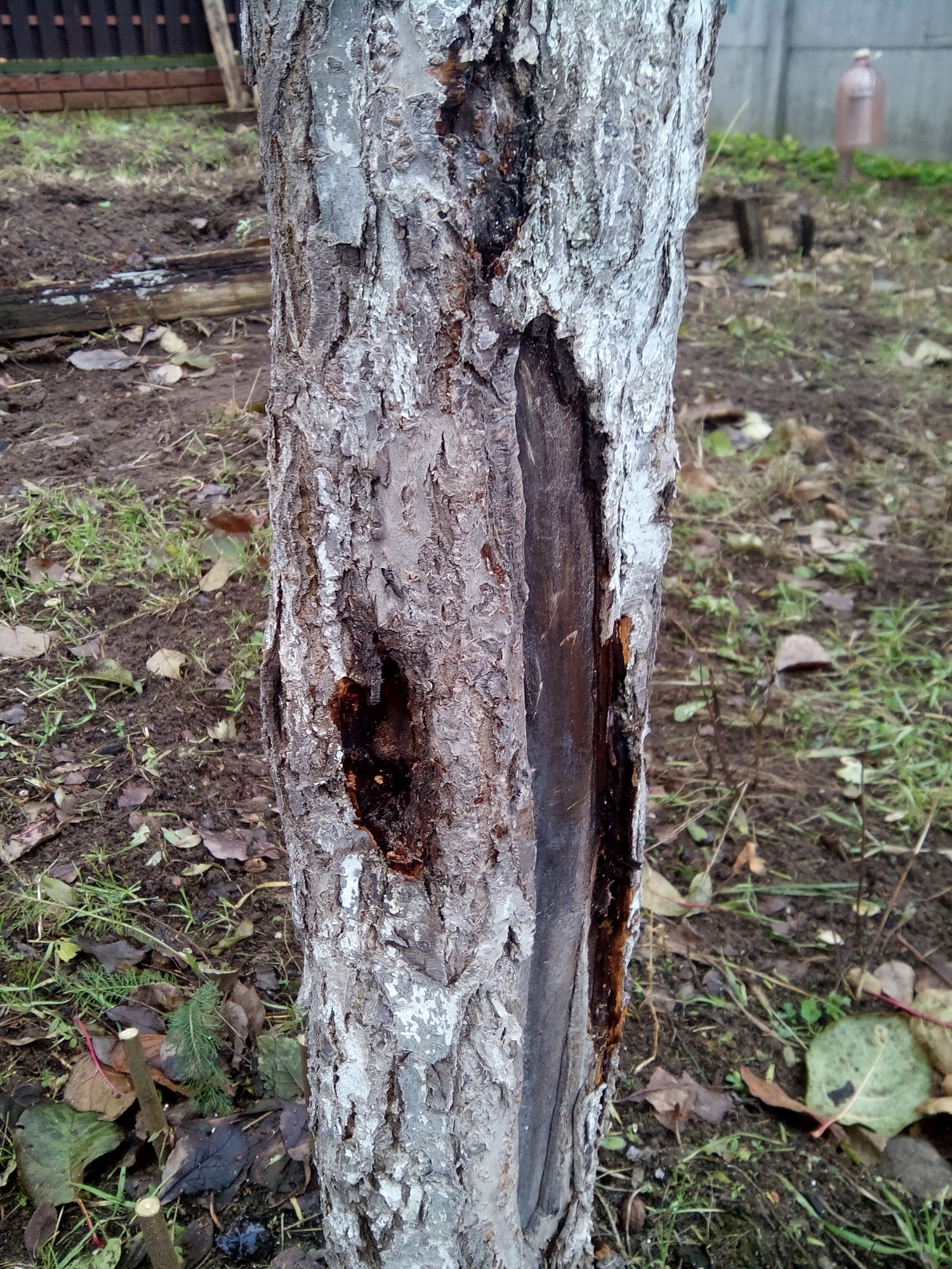 Чем вызвана такая проблема на стволе яблони (8-9 лет) и как с этим бороться на данном этапе? Два фото с разных сторон ствола.