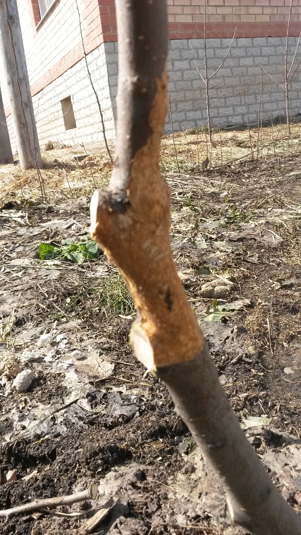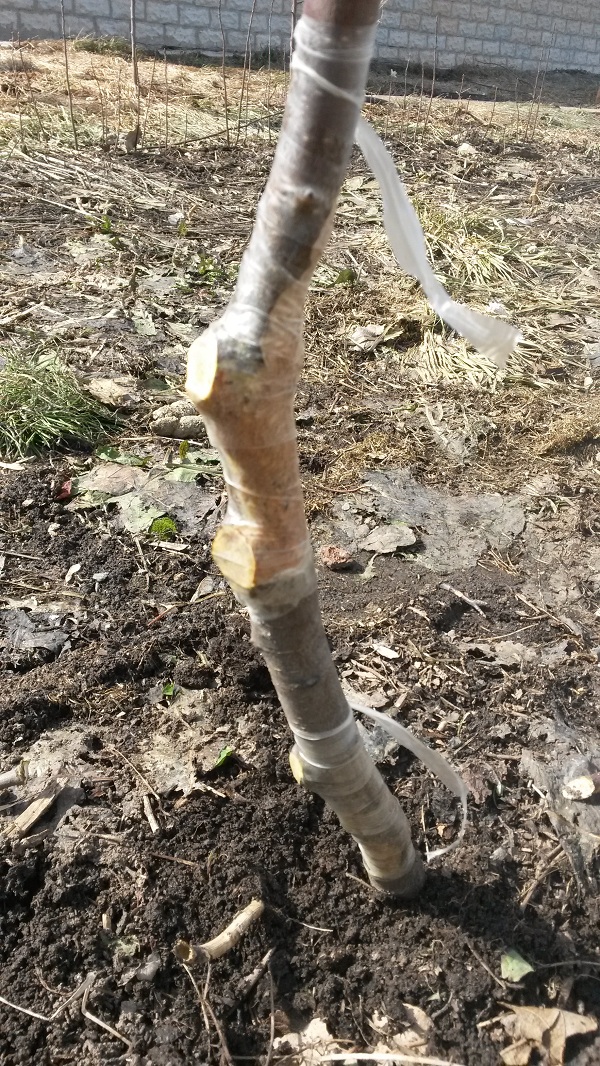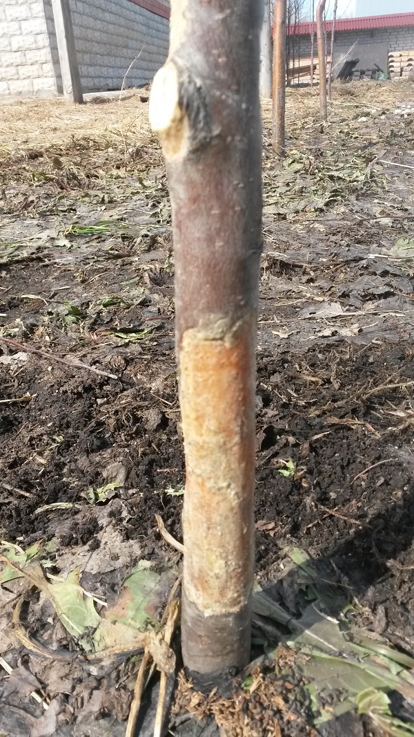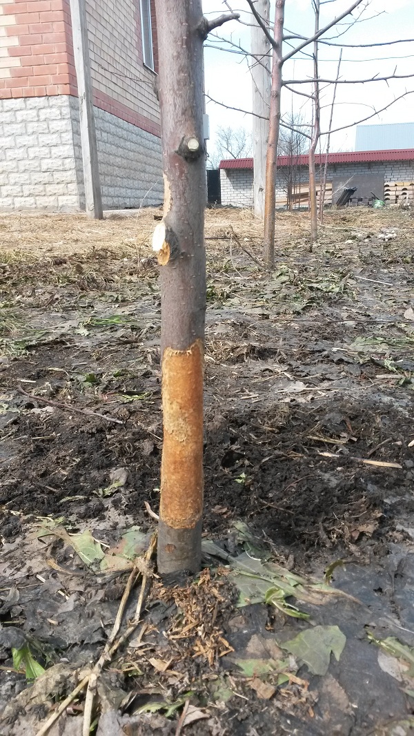 В эту зиму снега было много и только сошёл. После схода только увидел, что мыши сильно поразбойничали. Начал реанимировать. Место погрызов замазал садовым варом(воск+раст.масло)