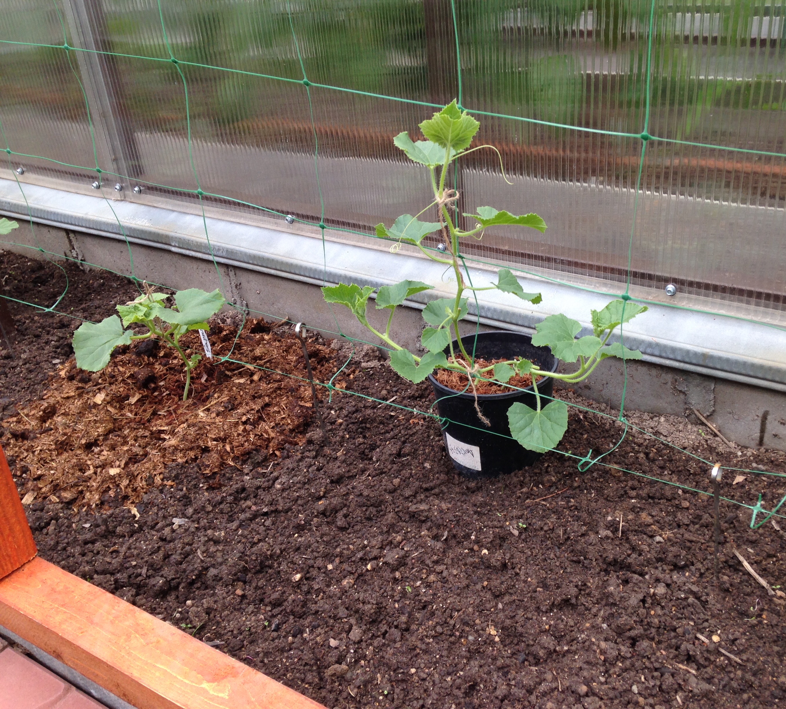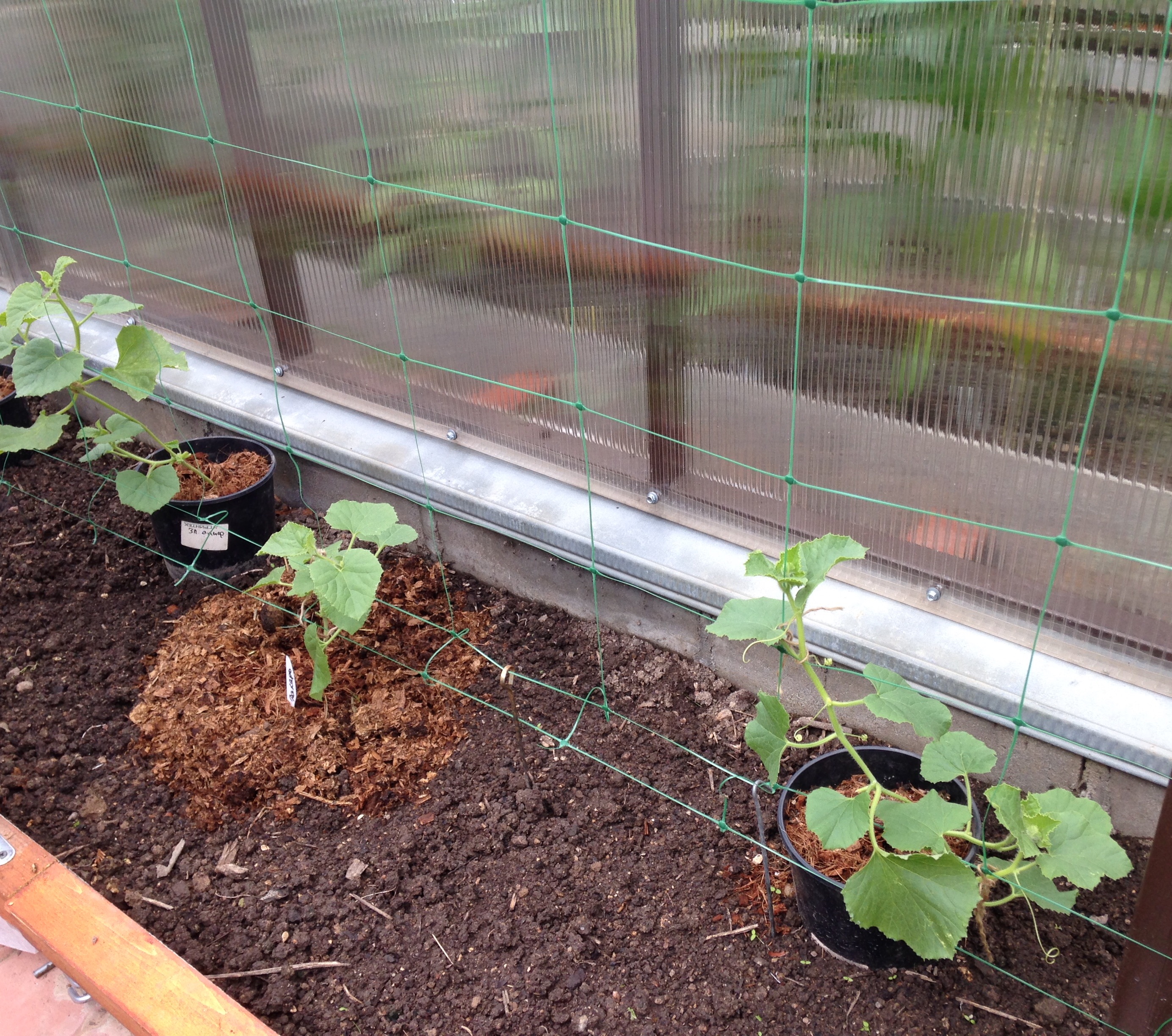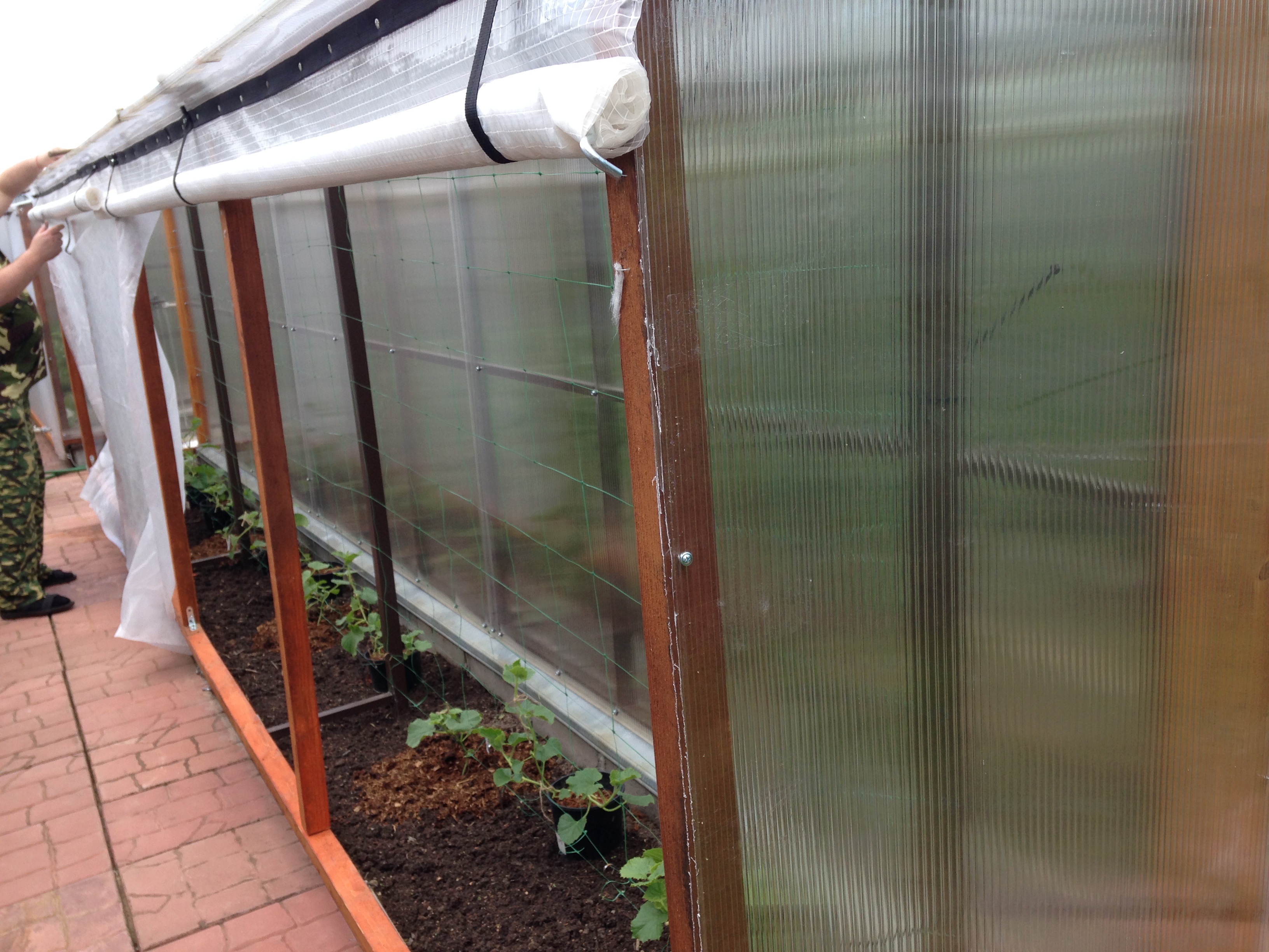 Дыньки в тепличной пристройке. Те, что высажены в горшках, явно крупнее. Ногам в горшке теплее, чем даже в высокой грядке. Прибиваем шторку-нетканку. За армпленкой жарковато.
