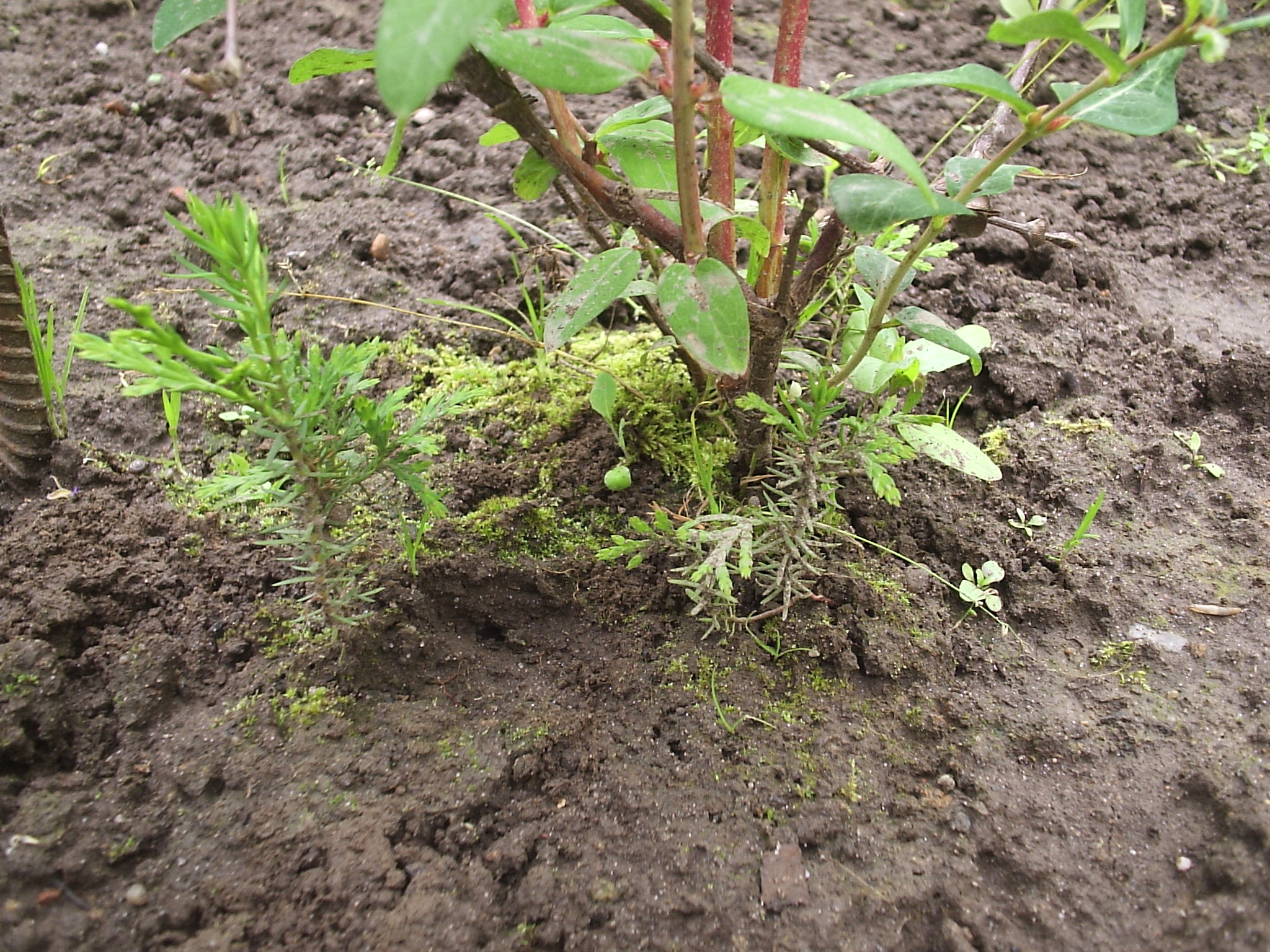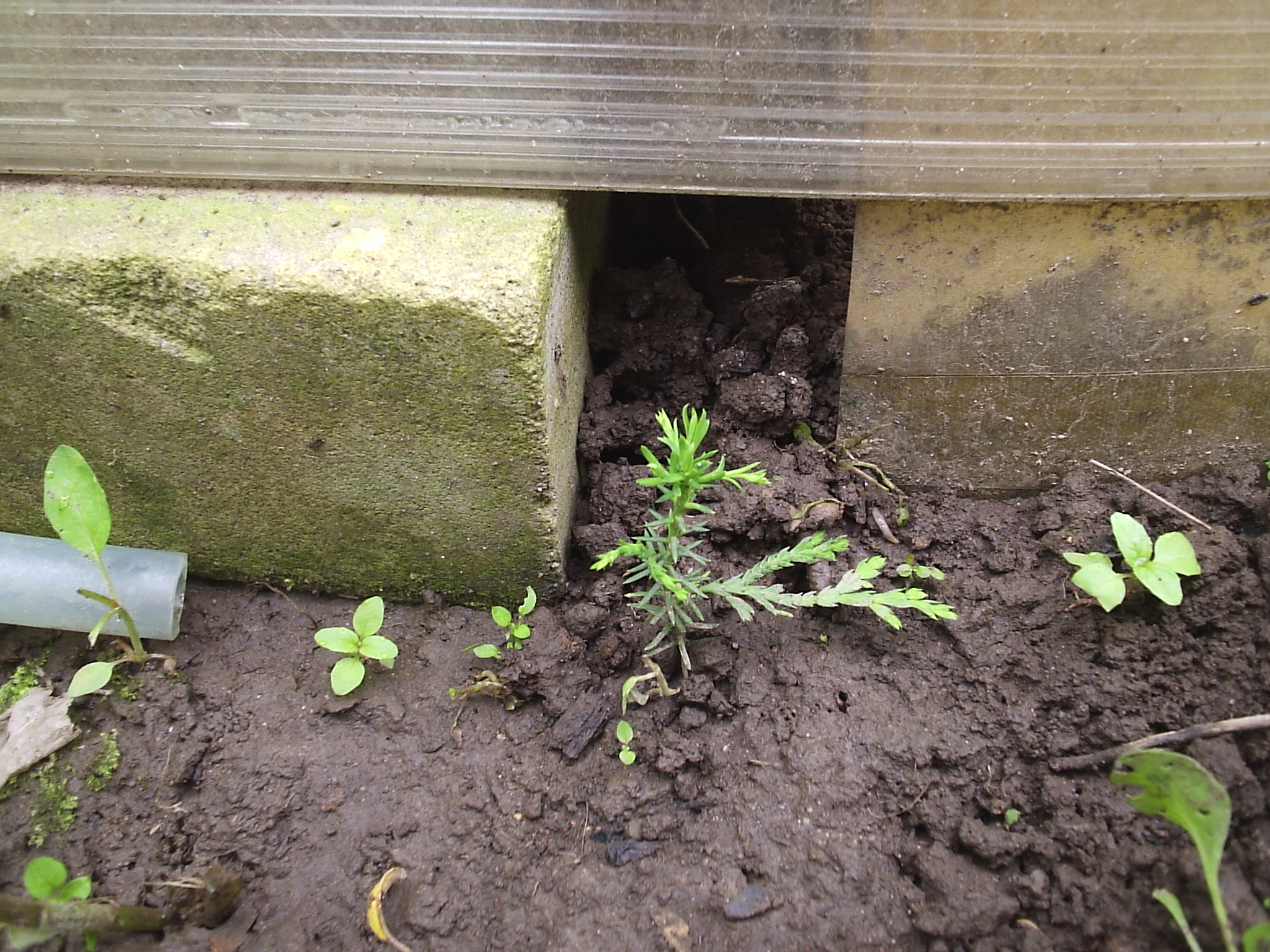 Полезли по неудобицам всходы , тут вот у самого парничка всход : А тут у основания кустика жимолости сразу несколько всходов сохранилось