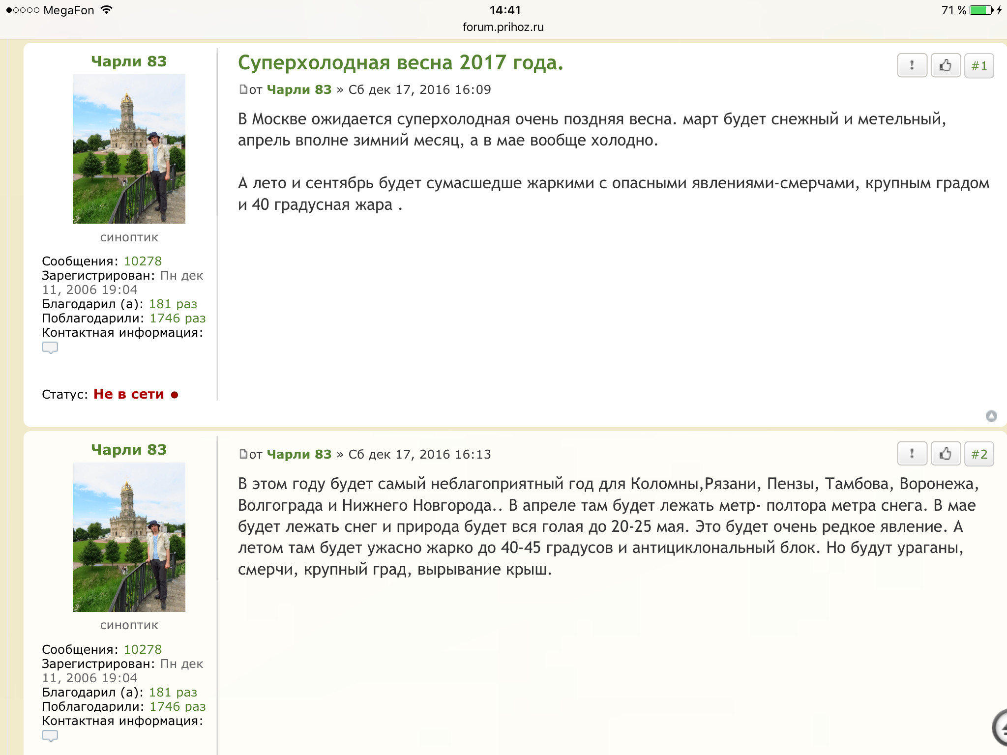 А прогнозы свои Александр берет на различных метеофорумах , в основном на Метеоклубе (правда он там под другим ником) , там таких прогнозистов пруд пруди , и за неделю прогнозируют , и за год , и большинство попадают пальцем в небо. Но выбирает в основном всякие жесткачи , типа холодов из Гренландии под -50 зимой или жары в МО + 40 летом. Ну хобби у него такое - людей пугать. Иногда как этой весной - угадал и напугал.