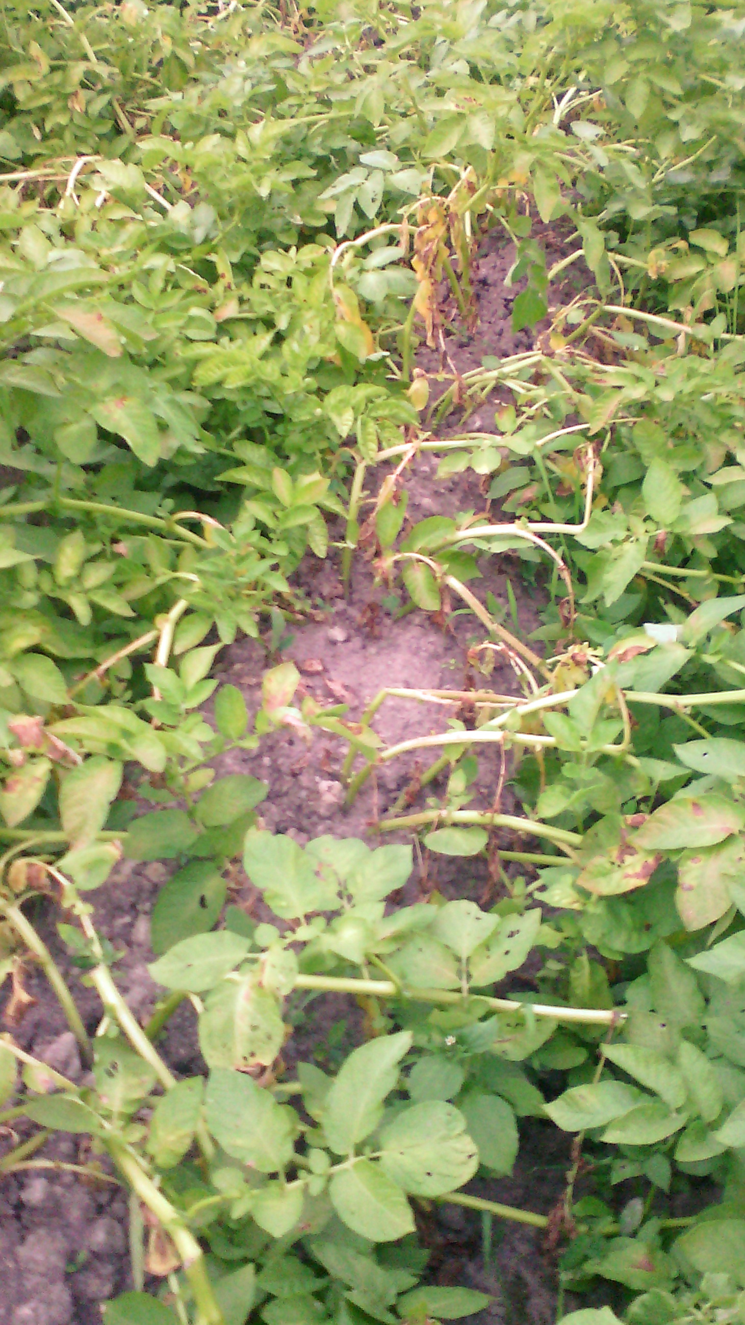 Сегодня был в деревне. Обнаружил фитофтору повсеместно, но меньше чем в прошлом году по состоянию на этот день. Обработки фунгицидами определенный эффект дали, хоть и не тот на который я рассчитывал. Сказывается патогенный потенциал семенных клубней большой репродукции, особенно сорта Ред Скарлет. Лучше всех противостоит фитофторе Галла, но и на ней есть пятна на верхних листьях. На Санте таких пятен не обнаружил, хотя нижний ярус практически весь заражён. Завтра опять обещают дождь на целый день. Воды уже по уши налило, похоже ещё добавка будет немалая.