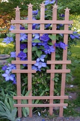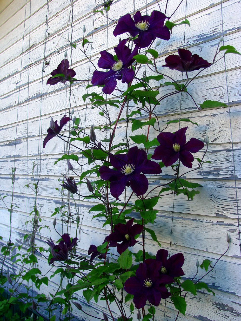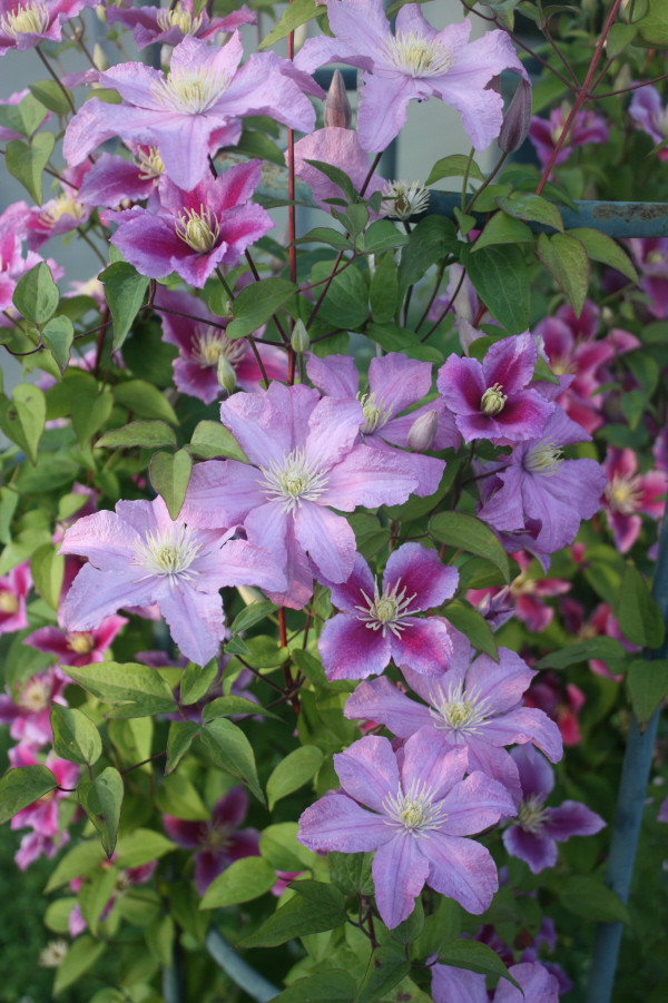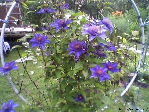 Я где-то писала - знакомая сделала ряд из высоких дуг. Вроде 4 штуки. Натянула нити к центру клема и получился ряд вееров. Я видела это сооружение без цветов, весной. Она говорила, что успевала расправлять плети по ниткам. Ей понравилось.