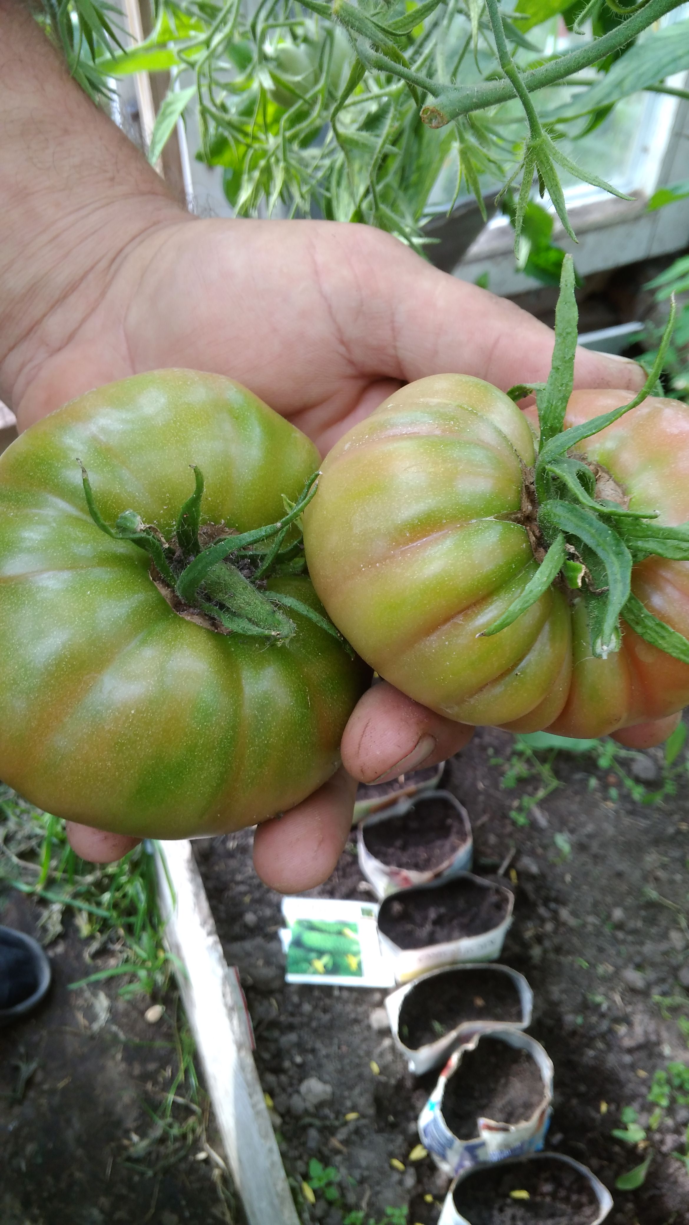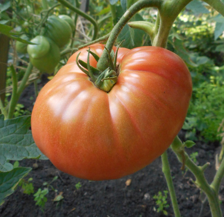 Малиновый брянский помидор ребристый самый первый в завязи. Потом растут ровнее. Сегодня в теплице разглядывали кусты и плоды.