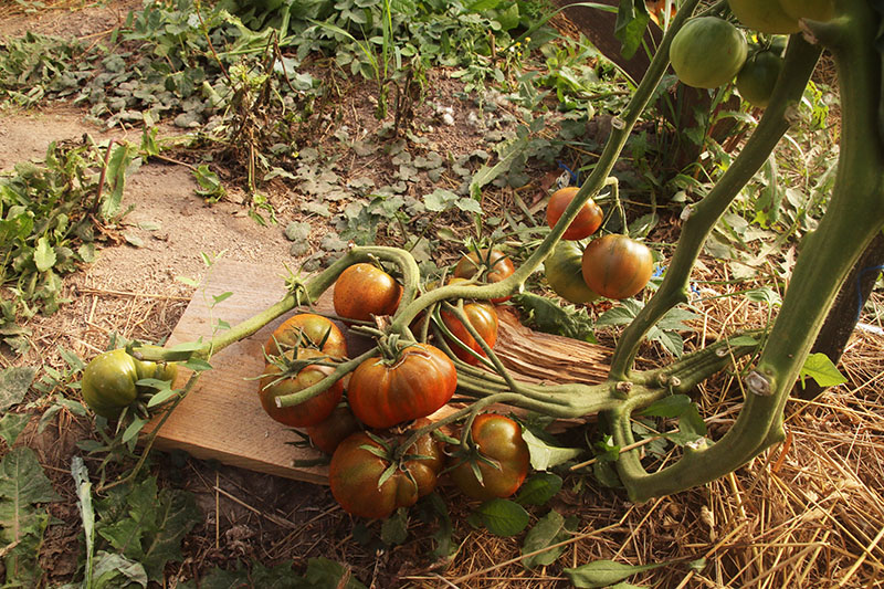 Вот, покажу сорт Кирюха, куст другой, но на этом лучше видно срастание стебля и кисть, вверх уже пасынки пошли, кисть уложена на землю, тяжёлая зараза, боялась по обрывает все подвязки. Вкус с описанием сорта и рядом не стоял, водянистые, кисловатые помидоры, хоть и чёрные, а толку... Муж на яичницу переводит. Лопаются сильно ещё на кусту.