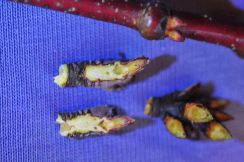 Абрикос Сын Краснощекого (снизу) - повреждений не нашел. Все разрезанные цветочные почки целые.