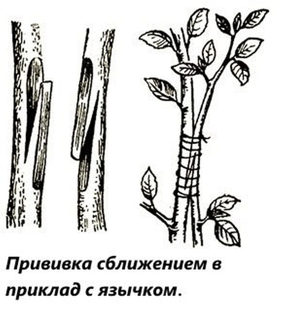 "Прививка сближением (аблактировка). Этот способ применяют для трудносрастающихся пород, а также в некоторых случаях перепрививки кроны, замены корней одного плодового дерева на другие и т п. Подвой и привой при этом способе прививки соединяются без отделения от маточного растения, т. е. они растут рядом. Весна-лучшее время аблактировки. Техника ее несложна. На подвое и привое (на одинаковой высоте) снимают полоску коры с древесиной. Желательно, чтобы на противоположной обнаженному месту стороне находилась почка. Прививку выполняют для большей прочности соединения улучшенной копулировкой вприклад с язычком (рис. 13). Прививочным ножом на обнаженных поверхностях делают расщепы: на подвое - сверху, отступя на четверть его длины от начала обнаженной поверхности, на привое - снизу, или наоборот, но в обоих случаях расщеп не должен доходить до конца обнаженного среза на четверть его длины, т. е. длина (или глубина) расщепа равна половине длины поверхности среза. Подготовленные таким образом растения совмещают обнаженными поверхностями, чтобы язычок одного зашел за язычок другого, а края коры подвоя и привоя совместились. Место прививки туго обвязывают. При перевязке надо соблюдать осторожность, чтобы не получилось разъединения растений в месте прививки, поэтому, перевязывают сначала одну сторону прививки до половины соединения, а потом вторую. Чтобы направить питательные элементы от привоя к подвою для лучшего их срастания, на привое ниже места прививки со стороны, противоположной прикладу, иногда делают до сердцевины зарез, его замазывают. После срастания компонентов, что определяют по сильному росту привоя, его отрезают ниже места прививки от своего корня; в это же время выше места прививки срезают крону подвоя. Поверхность срезов обмазывают садовым варом. Есть и другие способы прививки сближением, которые применяются для более толстого привоя и подвоя (вариант 3)".