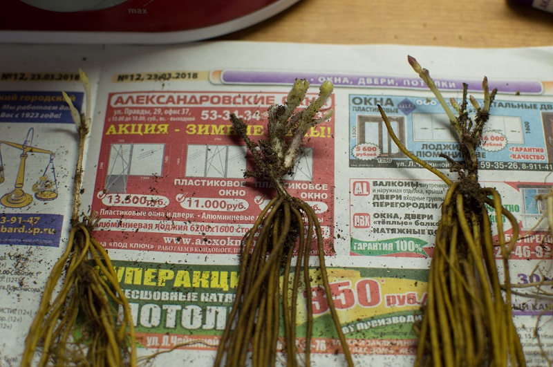 Под номер 77 скорее не жилец, черенок отломан (согнут). Все равно, его не трогала, и пока не вижу почек внизу, обратно в холодильник отправила, пусть еще "зимует". Корень хороший. А под 68 и 76 красуются на окне.