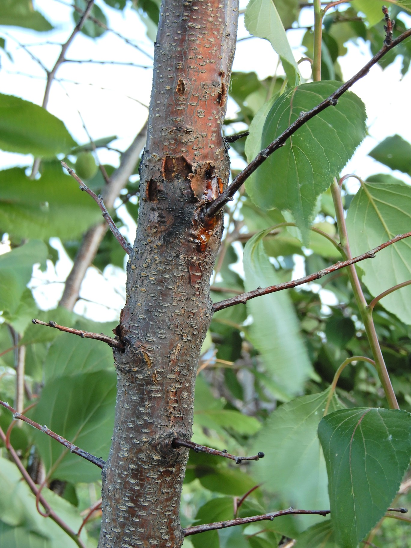 Есть два абрикоса сорта Саратовский рубин, один привит на терносливу (4 года), другой на абрикос (5 лет). Первое небольшое (привитый на терносливу в 2 раза больше) плодоношение было в 2016 году. После зимы 16/17 оба сильно болели, но вроде оклемались. Этой весной прекрасно цвели, но потом на привитом на абрикосе проявились морозобоины, стала выступать камедь.
