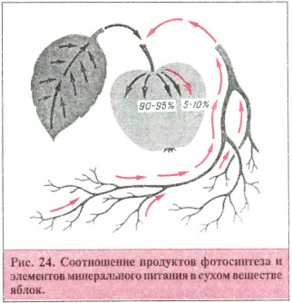 Вклад листового аппарата и корней в сухое вещество плодов: