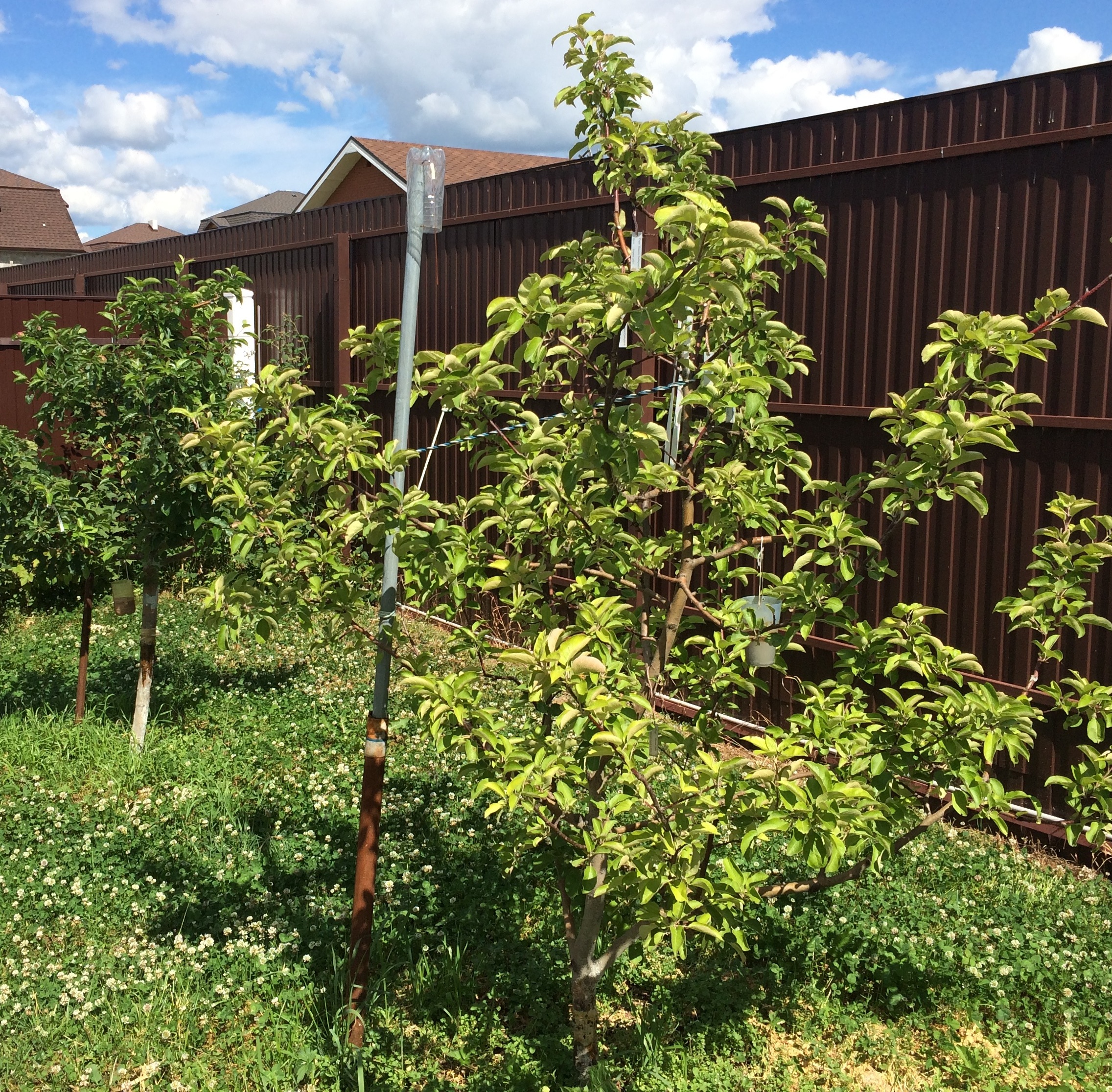 Я бы оставил лидером как на первом фото правый побег.Что уже получил вертикальное положение.Остальные выломал.О таком приёме узнал от Читала,модератора этого раздела,прфи со стажем.Не стоит этого бояться,саженец ещё мал и потерю части кроны легко компенсирует,нарастит.Питание корней осуществляется более старыми листьями,светлые и небольшие сами больше потребляют,чем производят.Поэтому стал отказываться от прищипки с последующим удалением,срезают лишнее сразу на кольцо для ускорения зарастан я ранок.В следующем сезоне эти срезы увличатся в разы диам