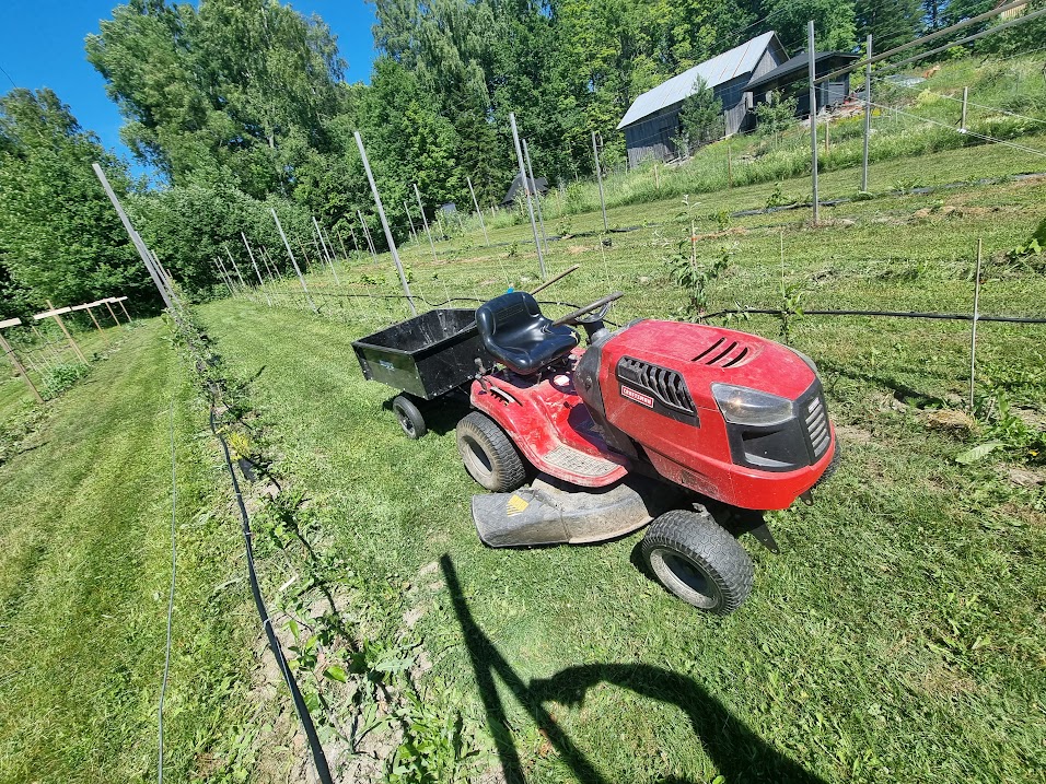 Я как-то пару лет назад купил бу газонный трактор MTD c двумя прицепами (один для сыпучих грузов, другой для бревен), отвал для снега, цепи. Ширина кошения более метра. Незаменимый агрегат.