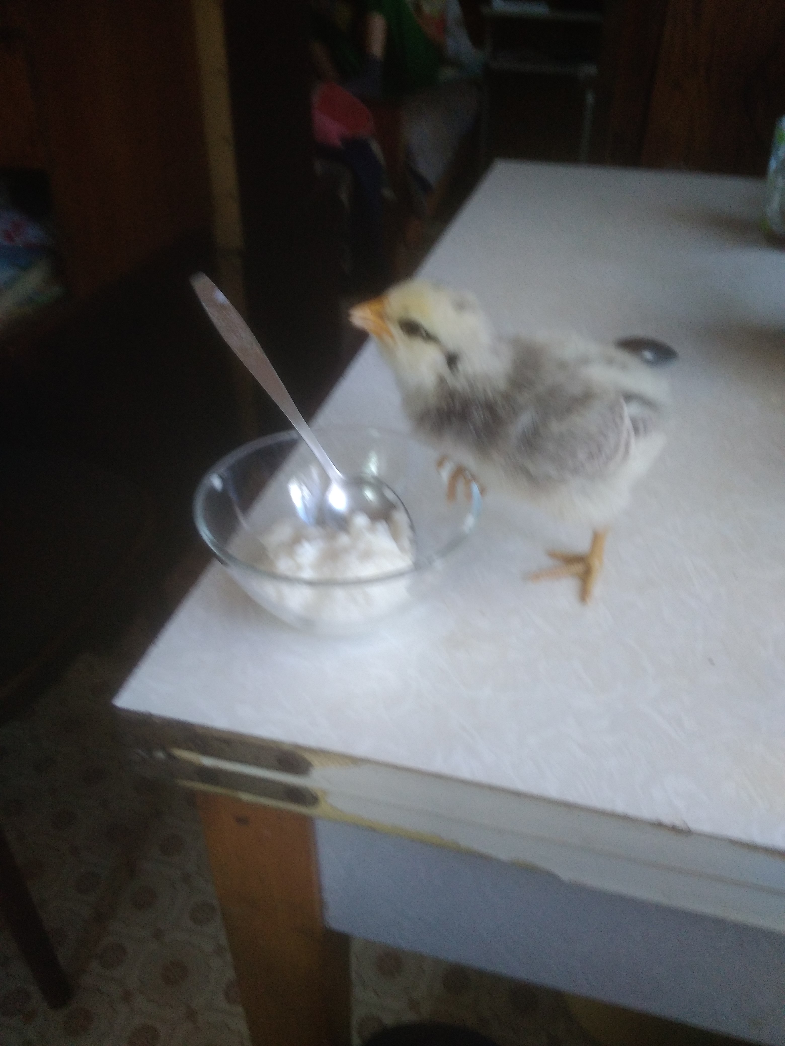 Кашу сначала им давали, ложили так, чтобы только курица доставала. Так она берет маленький кусочек, кладет цыплятам, чтобы они клевали.