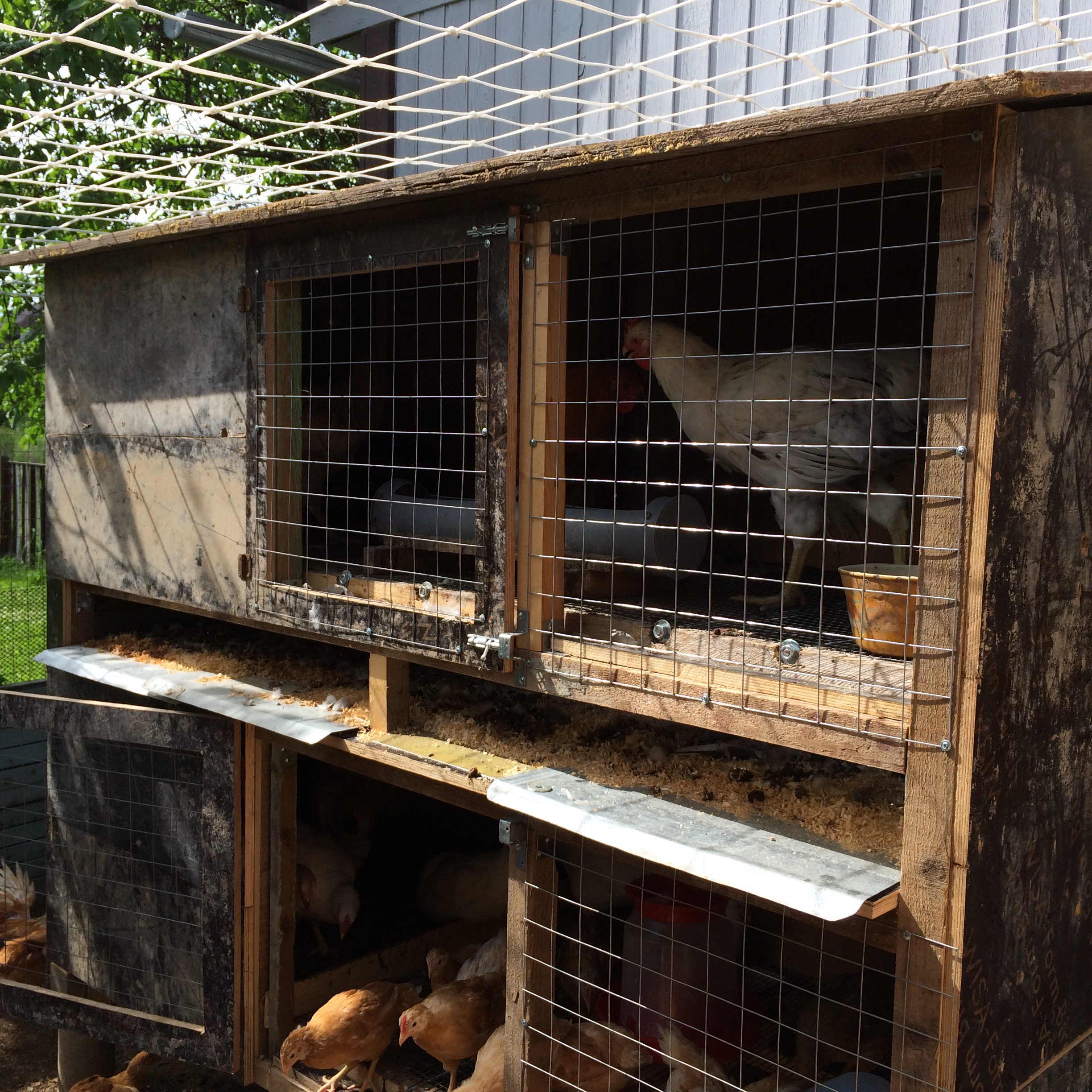 Как вариант, наши клетки на улице для молодняка из влагостойкой фанеры б/у. Не совсем удачное фото, но немного видно, что на первом этаже цыплята живут.)))