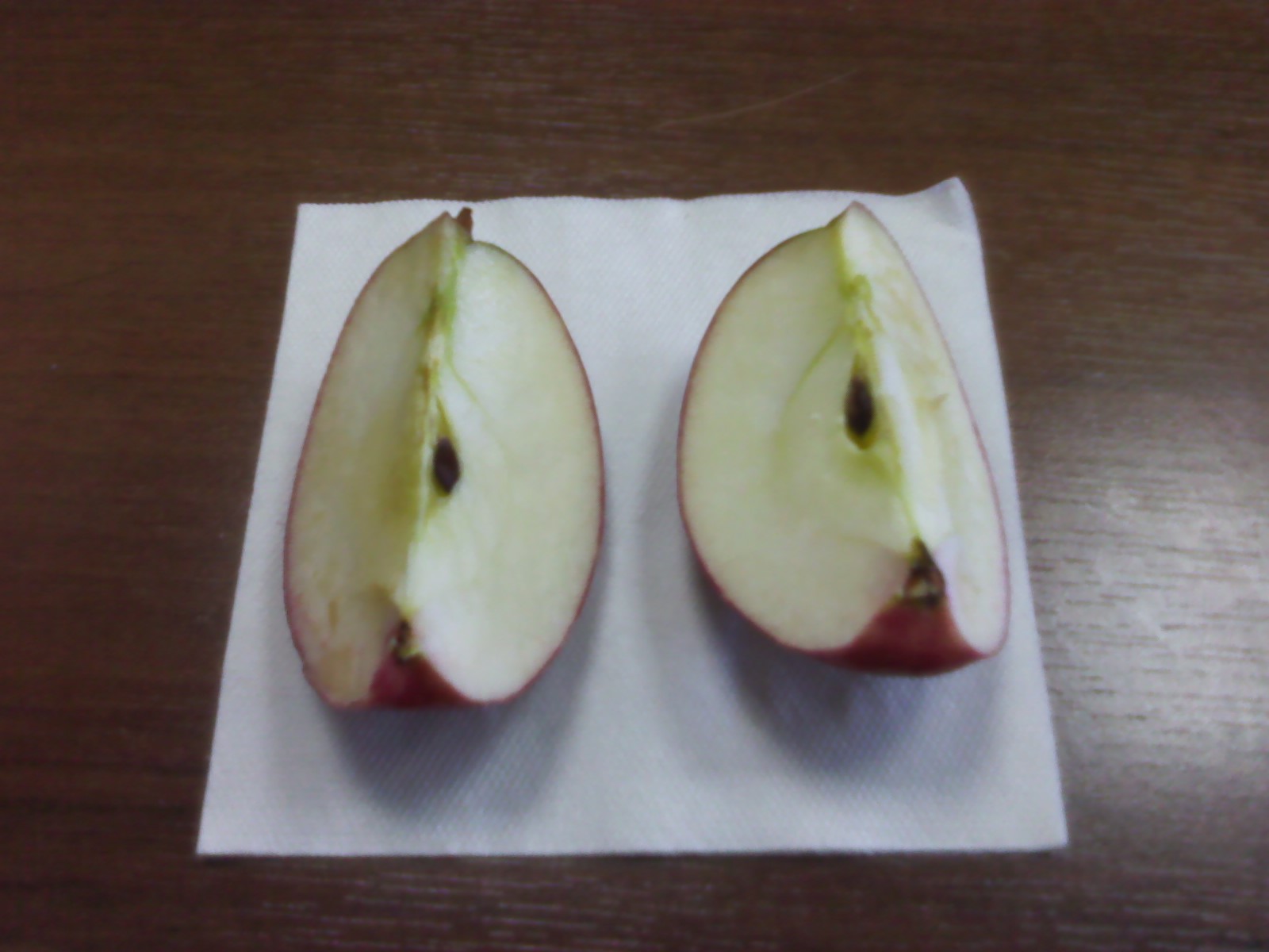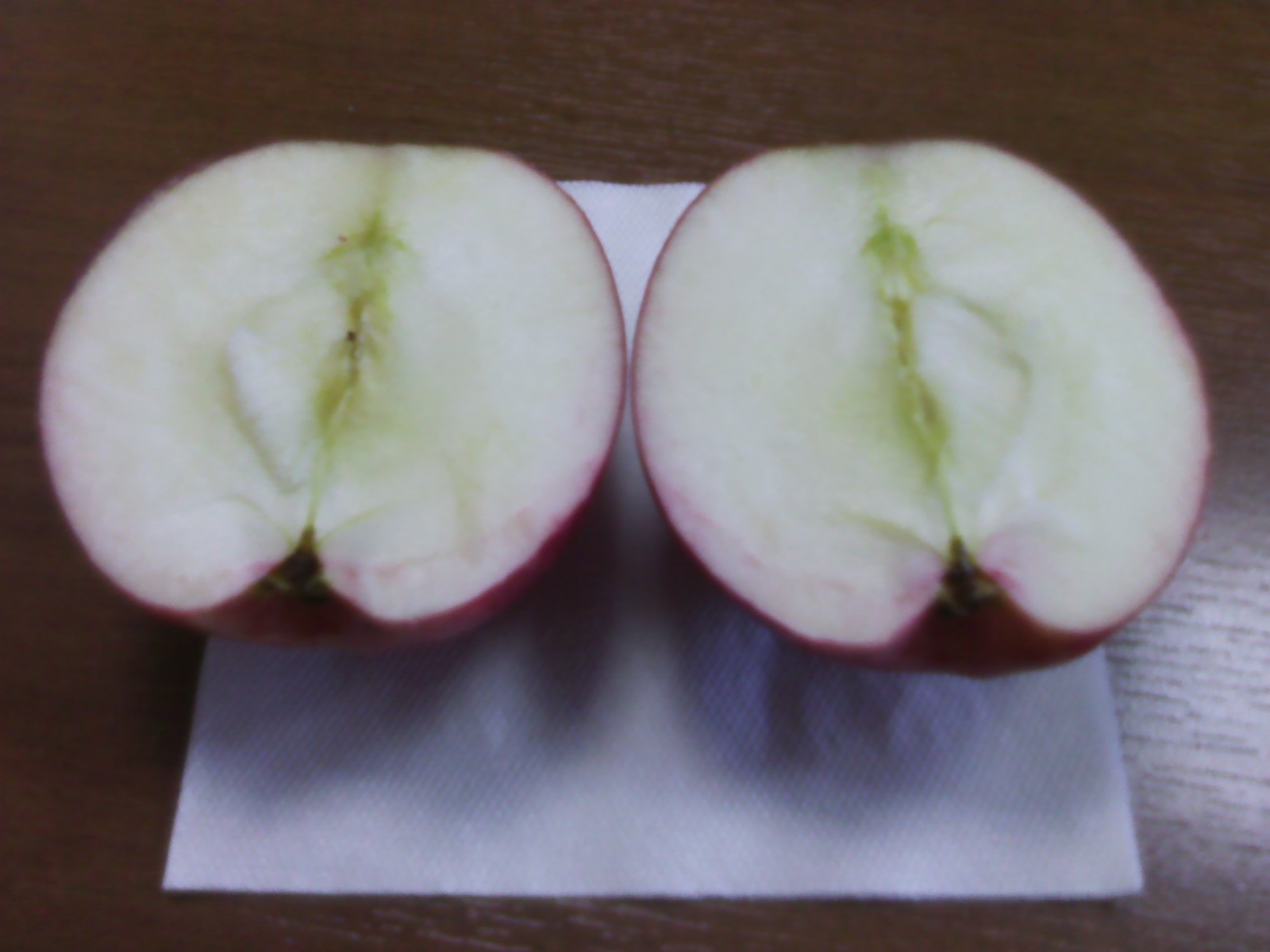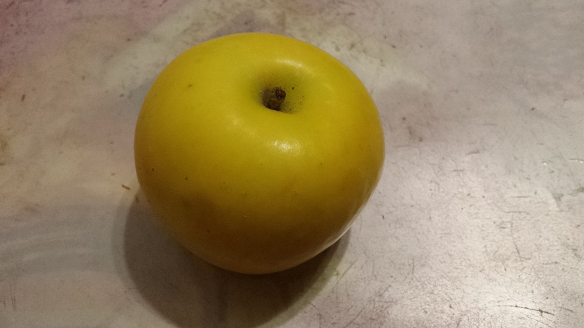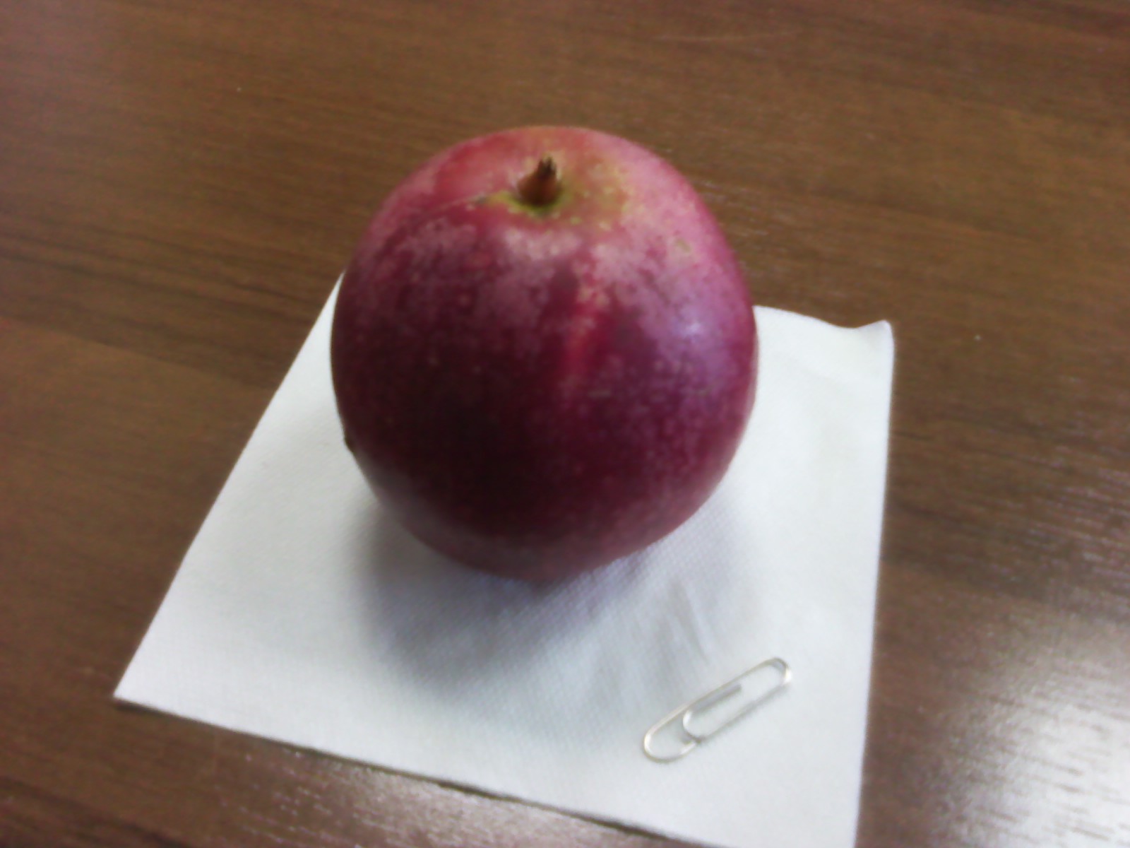 Яблоко среднего размера, нарядное, приятно держать в руке. Форма вытянутая, сливовидная. Воронка и блюдце мелкие, очень напоминает Дарунак, только без мрачноватого окраса. Семян мало, даже не удалось найти их с первой попытки, пришлось резать яблоко на четвертинки. Всего насчитал два семечка. Аромат средний. Мякоть средней плотности, средней сочности, белая, с розовыми прожилками, быстро темнеет на срезе. Вкус приятный, кисловато-сладкий. Скорее столовый, чем десертный. Официального описания пока не нашел, но, похоже, сорт осенний или раннезимний.