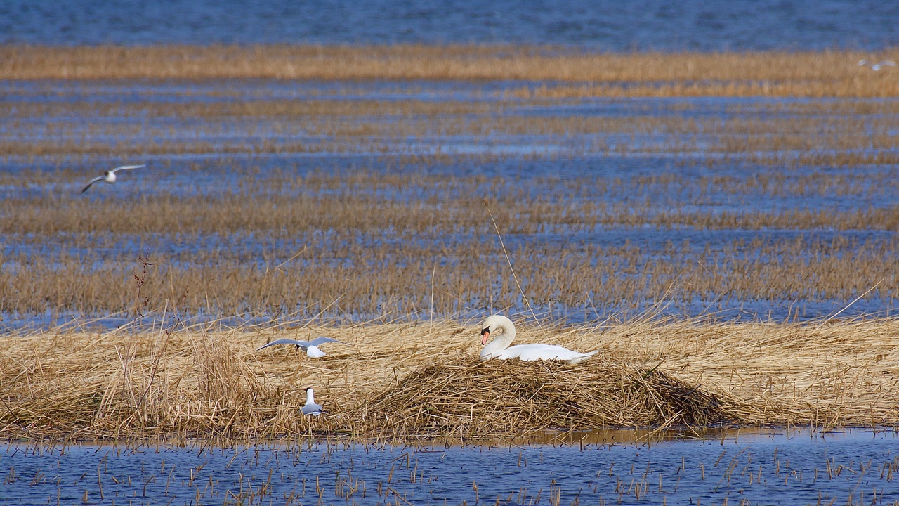 В субботу в плавнях около острова Котлин на Финском заливе обнаружили три гнезда лебедя-шипуна. Во всех трёх гнёздах самки уже насиживают кладку, а самцы рядом охраняют прилегающую акваторию.