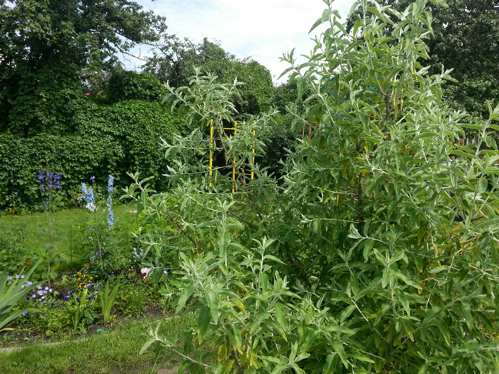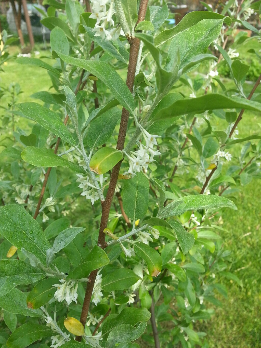 Как и обещал, что летом будет фото цветущего лоха.Был куплен с этикеткой Гуми.Но один товарищ определил его, как Акигуми (зонтичный).Я обещал признать свою неправоту, что и делаю с удовольствием.Век живи и век учись.Если это Акигуми-это даже лучше.Спасибо всем.